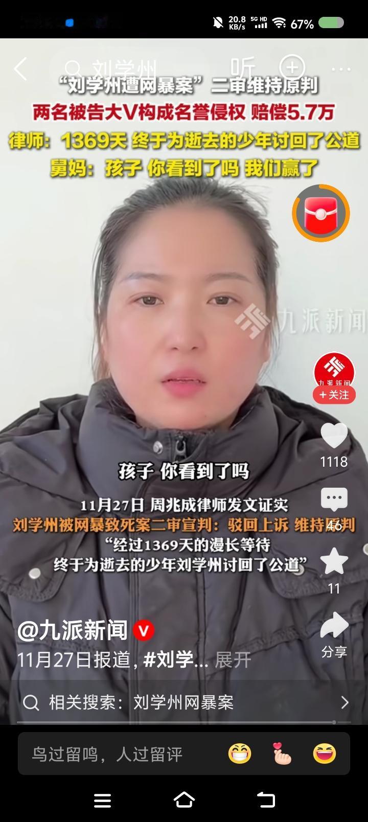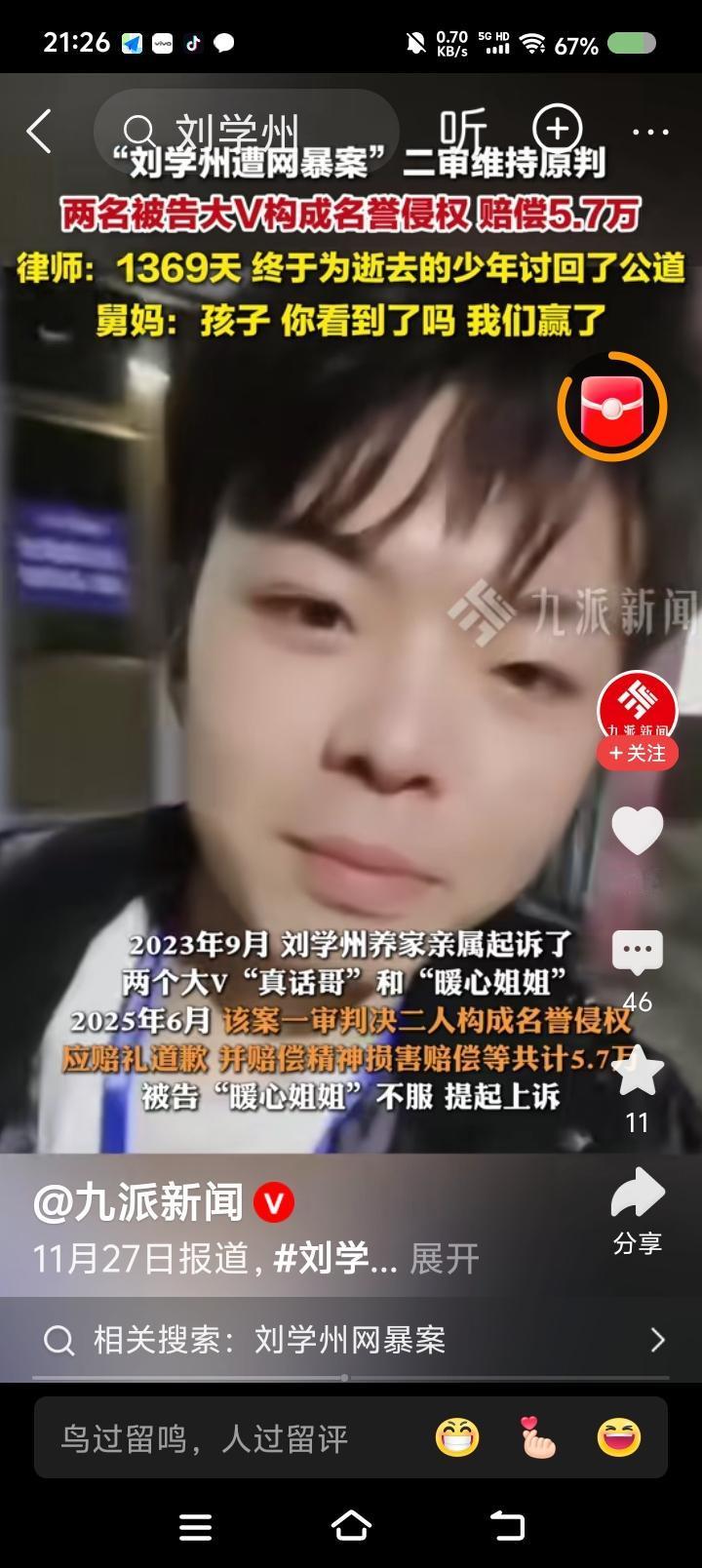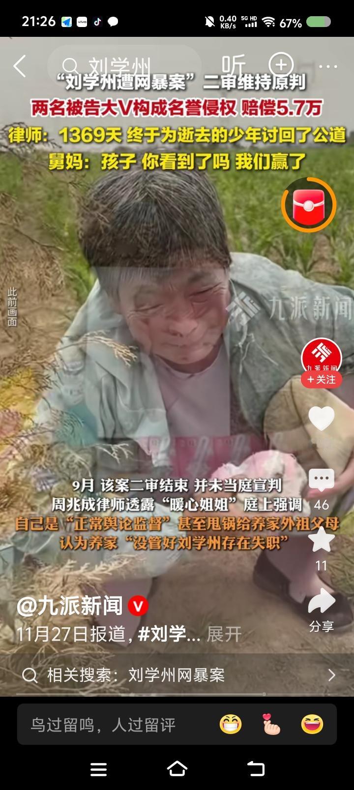 刘某洲事件是21世纪中国最大的事件之一!—— 据报道,刘某洲遭网暴案二审宣判,两名被告构成名誉侵权,判赔礼道歉,各种赔偿共计5.7万元。刘某洲亲属表示:“讨回了公道!” 点评: 一、果真? 二、刘某洲事件分四部分: (1)寻亲,并得知真相。 (2)寻亲后的遭遇,以及遭遇网暴。 (3)刘某洲自杀。 (4)“刘某洲遭网暴案”审理。 三、注意:一审后被告上诉的理由。 四、此事件透视了复杂的人性 ,是我国现阶段民众素养的一面镜子,是人类进化进程的一个片断。