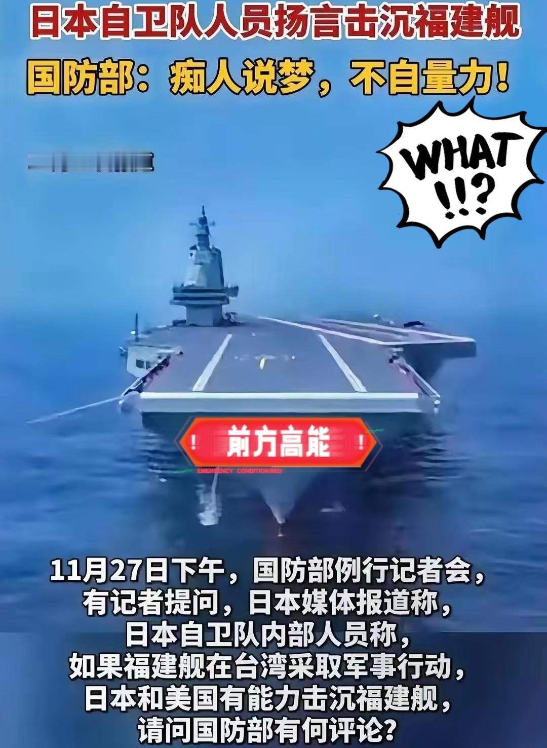 如今的日本早已乱了阵脚, 种种叫嚣与妄言,尽显其心智失常! 日本自卫队近日放出狠话,声称有能力击沉“福建舰”。 对于这种“痴人说梦、不自量力”的妄言,中国自然不会坐视不理,国防部早已明确表态:“我们坚决反对任何国家以任何借口干涉他国内政。台海事务是中国的内政,任何外部势力的干涉,必将遭到坚决有力的反击!” 作为我国自主研发的大型航空母舰,福建舰不仅自身防护体系完备,其配套的航母战斗群更具备多层次、立体化的防御能力,且搭载先进反鱼雷系统,整体防御实力位居世界前列。 日本自卫队偏偏盯上福建舰,扬言要用12式反舰导弹将其击沉——但事实是,12式反舰导弹基础型射程仅约200公里,即便改进型射程提升至900公里,也难以突破航母战斗群的多层防御网;同时其末端巡航速度较慢,在现代防空反导体系面前,突防能力有限,根本不足以对福建舰构成实质威胁。 日本这番叫嚣,实则暴露了其深层战略焦虑。随着中国在亚太地区的影响力持续提升,日本自卫队妄图借台海问题炒作“中国威胁论”,推进军备扩张,甚至抱有重温二战时期侵略野心的幻想,试图配合美国“印太战略”搅乱地区局势。 但这种盲目膨胀的叫嚣,终究是自娱自乐的痴人说梦:中国捍卫国家主权、安全、发展利益的决心和能力不容置疑,任何试图挑衅的势力,都将付出沉重代价! 网友评论太硬核了:“福建舰有先进反鱼雷系统,还搭配055、052D组成护航群,防御跟铁桶似的!日本12式导弹连突破防御圈都难,还敢说击沉?纯属嘴炮硬撑!” 日本自卫队说能击沉福建舰,纯属瞎叫嚣!这根本不是有实力,而是怕中国在亚太越来越强,心里发慌罢了。大国较量拼的就是硬实力和定力,咱们福建舰防御够强,国家态度也硬,这才是护主权的底气。想靠挑衅搅局?最后只会自讨苦吃,和平从来都是靠强大国防撑起来的! 大家对此有什么看法?欢迎评论区留言