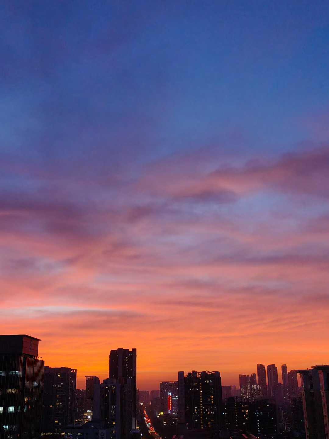 揉着僵硬的脖子冲出办公楼,加班到昏头的疲惫还挂在脸上,结果抬头的瞬间直接被老天爷投喂了绝美晚霞!🌇 天空像被泼了桶滚烫的橘红颜料,从云层边缘晕染开,连带着边角都镶上了金边,云朵不再是单调的白,而是裹着玫红、鎏金,像燃烧的棉絮飘在半空。风是暖乎乎的,吹在脸上刚好抚平紧绷的神经,路边的树影被晚霞拉得长长的,连路灯都跟着温柔起来。 刚才改方案的烦躁、赶 deadline 的焦虑,在这抹红面前全散了!原来加班后的惊喜,是抬头就能撞见的浪漫呀~ 此刻只想站在路边多望一会儿,把这份热烈的美好揣进心里,明天又是元气满满的一天呀!✨