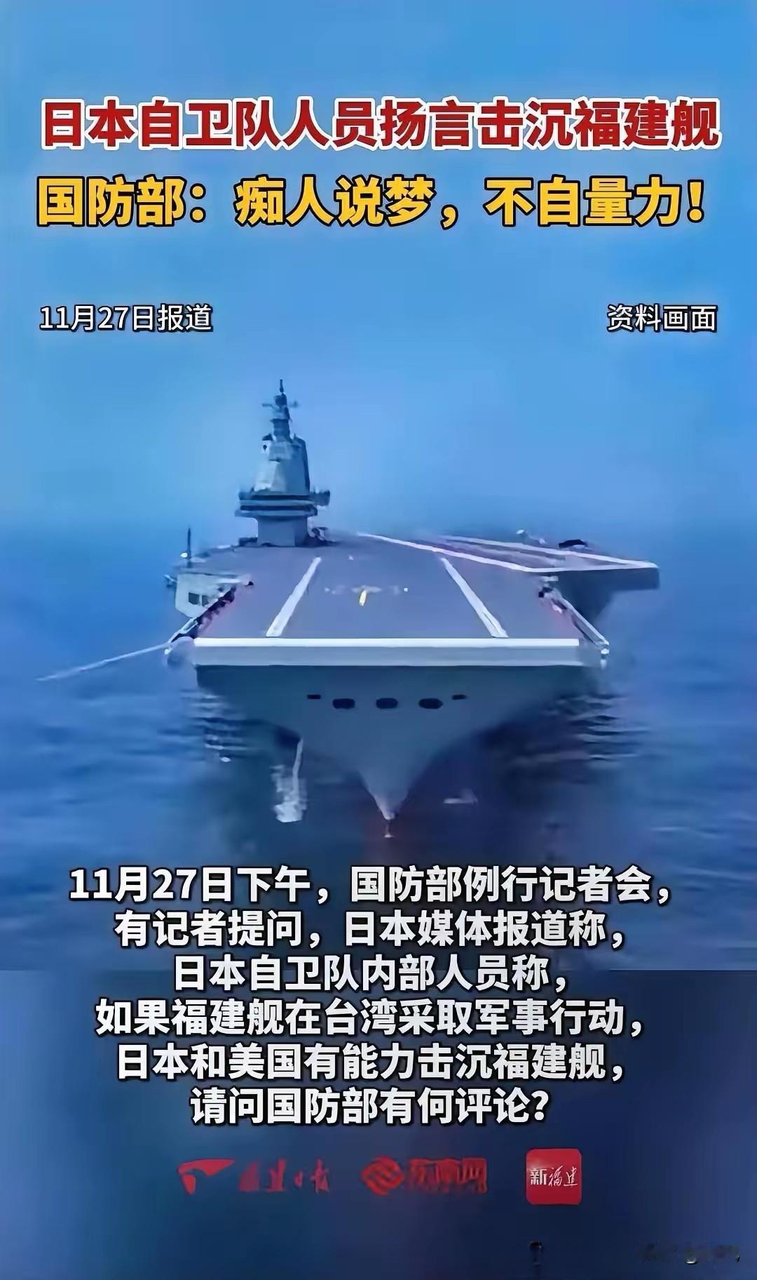 日本已经崩溃了, 似乎精神错乱, 他们的自卫队今天公然声称,有能力来把咱们的大家伙击沉,这不禁让人怀疑,他们是不是脑子不清醒了? 中国国防部直接用“痴人说梦、不自量力”八个字怒怼,字字戳破这场荒诞闹剧。 日本所谓的底气,无非是即将列装的改进型12式反舰导弹和400枚美制“战斧”导弹。 可这些亚音速导弹,面对我国航母铜墙铁壁的立体防御网,突防概率低得可怜。 2025财年8.7万亿日元的防卫预算,创下历史新高,却填不满其疯狂扩军野心。 一边喊着“击沉航母”,一边自卫队招募仅完成半数,人员缺口大到离谱。 他们忘了,现代海战是体系对抗,绝非单一武器能决定胜负。 日本在西南诸岛部署导弹,妄图构建威慑网,却摆脱不了美军的情报控制。 首相高市早苗推动防卫费占GDP2%,甚至图谋核动力潜艇,军国主义苗头毕露。 这是对二战战败历史教训的公然漠视,更是对地区和平的严重挑衅。 借“中国威胁论”扩军,炒作台海议题,本质是想阻碍中国发展的险恶用心。 我国福建舰的电磁弹射、防空反导系统,早已形成全方位防御屏障。 日本脱离现实的挑衅,只会打破地区平衡,遭周边国家共同警惕与反对。 二战的惨败结局犹在眼前,却敢重拾冷战思维,无疑是自寻死路。 中国军队捍卫主权的决心坚如磐石,任何挑衅都将付出惨痛代价。 时代早已不同,想靠狂言遏制中国崛起,注定是竹篮打水一场空。 各位读者你们怎么看?欢迎在评论区讨论。日本军事挑衅