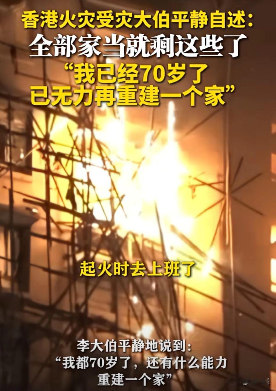 彻夜难眠 谁能想到 43分钟就烧穿8栋楼!香港宏福苑这场五级大火太痛心 55人遇难、72人受伤,37岁消防员也殉职在火场 70岁李伯住了30年的家只剩随身几件东西 罪魁祸首竟是施工竹棚架 没做阻燃处理,遇火成“助燃天梯” 12分钟就窜到40楼,再加上老楼消防栓水压不足、警钟失灵,活生生把逃生路堵死 全港还有多少这样的老旧小区 消防老化、施工违规,这些“定时炸弹”为啥总要等悲剧发生才重视 城市安全不该靠“事后惋惜”,你觉得该怎么把隐患掐灭在萌芽里?