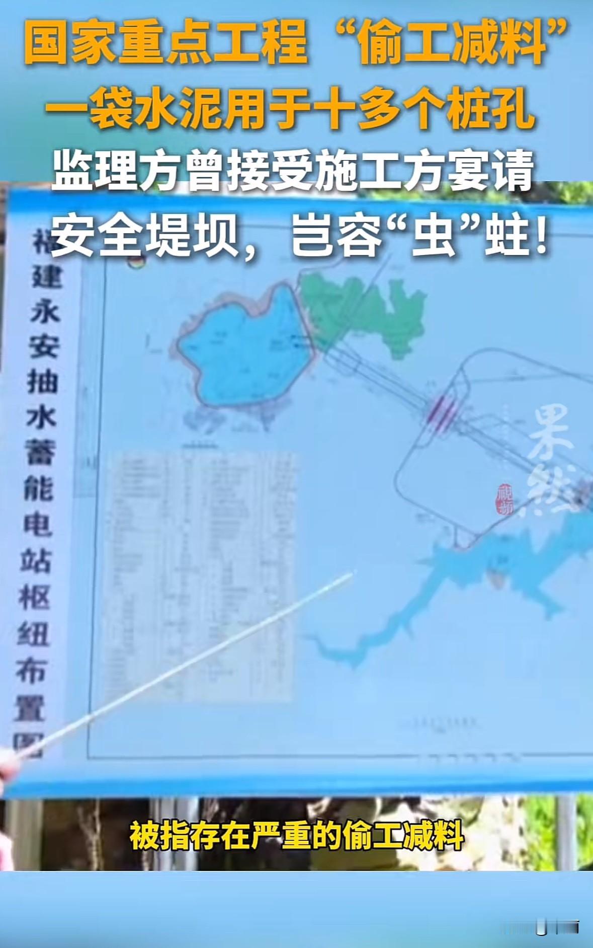 国家“十四五”重点工程福建永安抽水蓄能电站,被曝下水库大坝偷工减料。12米设计的锚筋桩实际仅2-5米,1袋水泥凑十多个桩孔,还漏装注浆管,监理更收宴请和有偿陪侍,监管形同虚设。同一电站8月曾发生边坡垮塌,涉事的水电三局还拿未批变更搪塞。 重点工程是民生底线,怎能为省成本置安全于不顾?专家说这会让大坝抗滑能力降3-5成,隐患埋在山里太吓人。监管链条失守才是关键,希望能严查到底,追究相关方责任,别让“百年工程”变成“隐患工程”,给公众一个放心的交代。