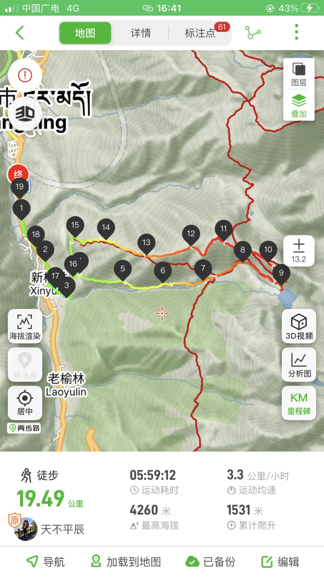 ⭐一、基本参数 ❶路线:康定白海子,山谷线上,山脊线下 ❷行程:公共交通版,康定汽车站乘坐2路公交到终点站,步行2.5公里到白海子徒步起点,山谷线爬升至白海子,山脊线下降至徒步起点 ❸起点:岷山部落大酒店 ❹终点:岷山部落大酒店 ❺最低海拔:2817m ❻最高海拔:4260m ❼累计里程:19.49Km ❽累计爬升:1531m ❾累计下降:1518m ❿全程耗时:10小时13分钟(以上数据来源于两步路) 🌻风景:瀑布、湖泊、雪山 ⭐二、关于路线 康定白海子是位于康定市郊区的一个高山湖泊,坐落于白海子山下,海拔4140米。路线有山谷线和山脊线之分,连成一个小环线,可一日速穿,可重装露营,也可将附近的海子串联起来形成多日长线。小环线全长约15公里,最高4260米,爬升约1200米,下降约1200米。 ⭐三、关于风景 白海子坐落于白海子山下,湖水清澈深邃、幽兰碧绿;山谷溪水潺潺、瀑布从高处落下,蔚为壮观;山脊有草甸,可俯瞰白海子、蛇海子、康动城,可仰望白海子山、蛇海子山、笔架山等雪山,也可远眺折多山、九海子山,也可能出现云海。 ⭐四、关于交通 去程/返程:①我是公共交通出行,从康定市区乘坐2路公交到终点,再步行2.5公里到达徒步起点;②也可乘坐6路公交到终点,步行几百米到徒步起点;③也可打出租车到起点,按里程打表。(定位点:榆林特勤消防中队) 途中:有马帮驼包到湖边,路上有联系方式。 ⭐五、关于路况 我是从山谷线上山,山脊线下山。山谷线一路爬升,有陡坡、乱石、临崖路段,路上牛屎多,阴雨天气路况湿滑,建议带登山杖,我没有带登山杖走三步退一步;山脊线路况良好,有些路段路迹不明显,大雾天气更不好找路,注意辨别。 ⭐六、关于营地、住宿、补给 徒步起点有民宿、饭店、商店,可吃饭住宿补给;白海子有牧棚,有方便面可售;白海子可扎营。 ⭐七、关于行程 不管是从山谷线上山还是山脊线上山,尽量早点出发,太晚了可能要走夜路。 7:20左右我从市区坐上2路公交 7:50左右到达2路公交终点 8:17到达白海子徒步起点 12:18到达白海子湖边 13:55爬上山脊线 14:48到达山脊最高点 16:02开始下山 17:11下到达机耕路 17:37回到徒步起点 18:04到达2路公交终点站 ⚠️白海子是康定引用水源,请勿乱扔垃圾,请勿污染水源。