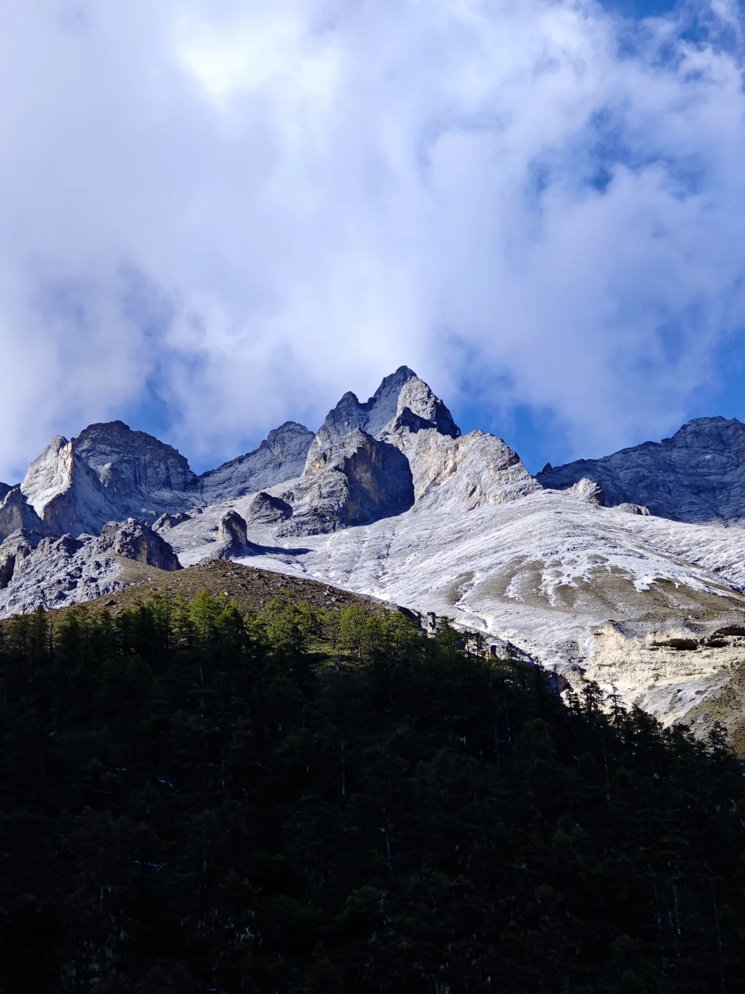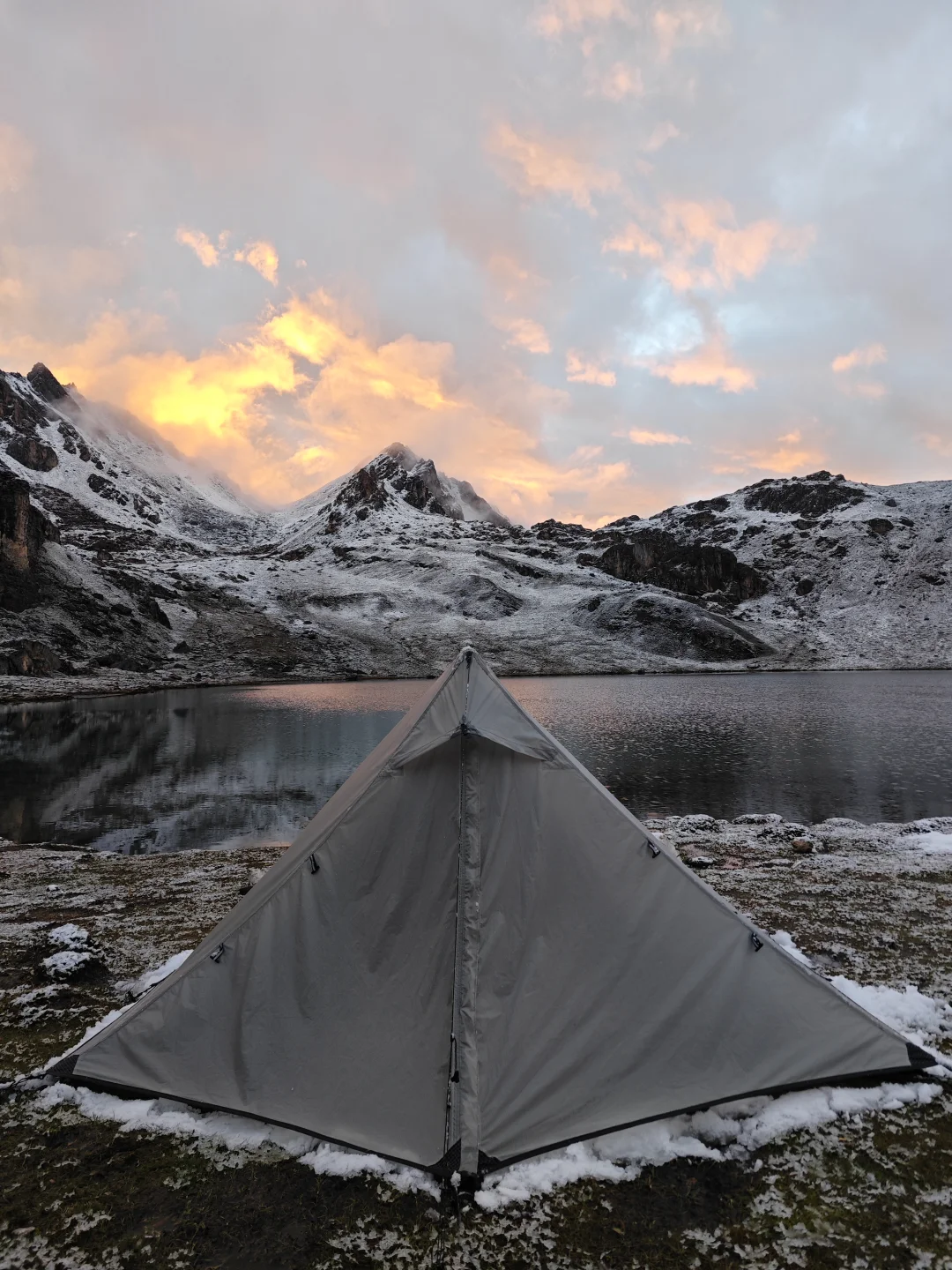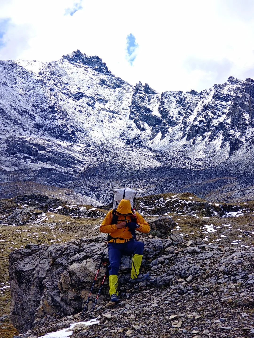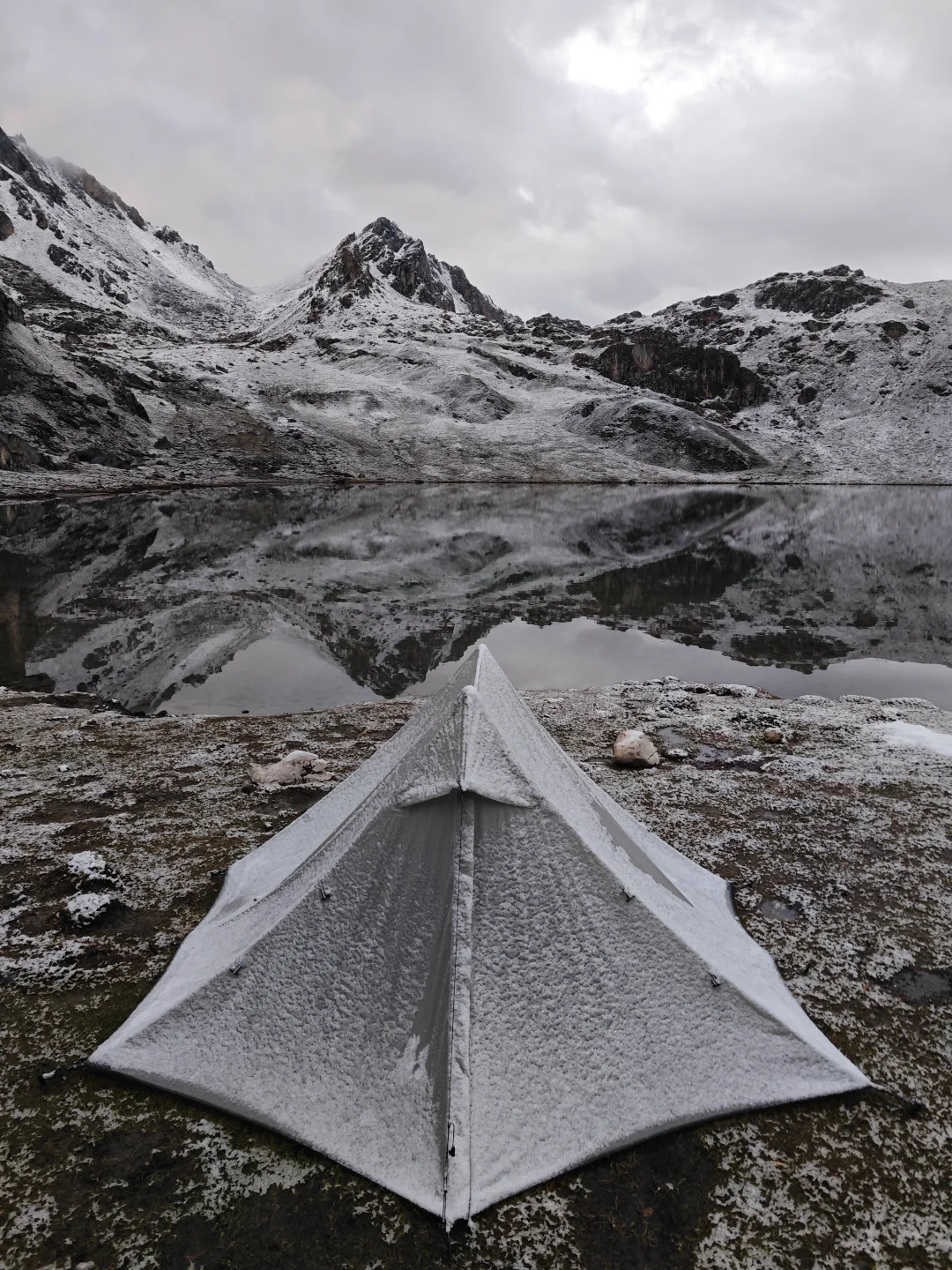 一早醒来,打开帐篷,山上白茫茫一片,晚上竟然下雪了,这是在川西徒步一个月第一次下雪,也算是邂逅了2025年的第一场雪吧。