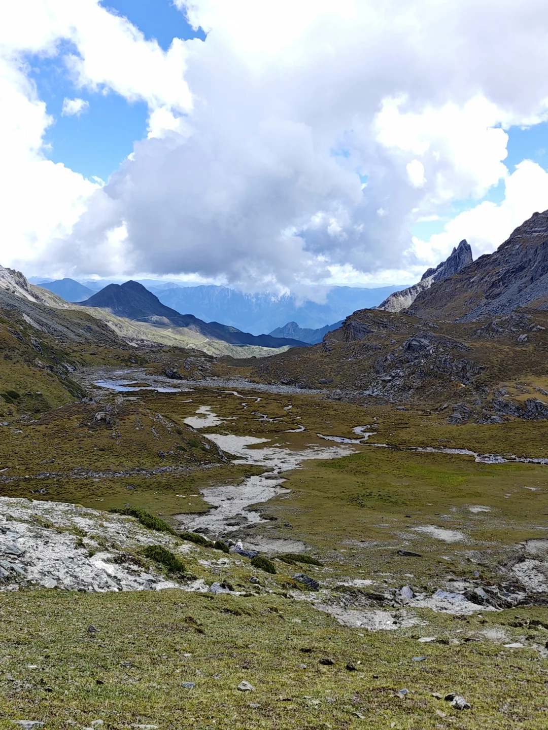 吃过早餐,晒干帐篷,收拾好营地已经10点半了,前面陆续有六七个人拔营先走了,我是最后一个。昨天我还以为波拥措营地只有我和另外两个人,没想到山包后面还有七八个人扎营,今天早上有2个人因高反下撤回去了。