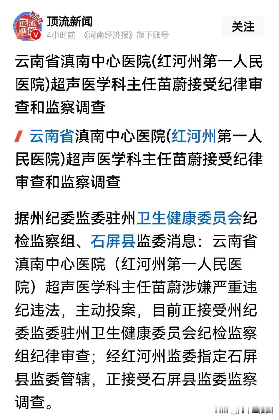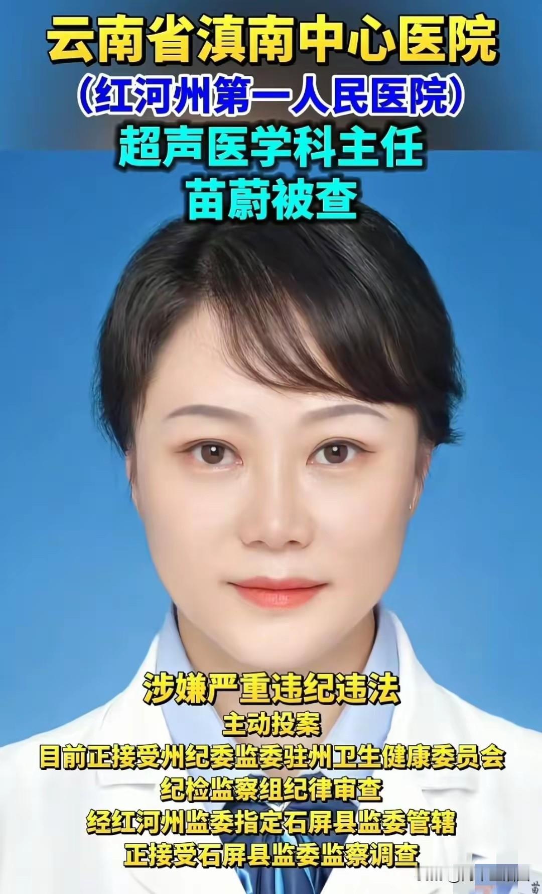 今天滇南中心医院的苗蔚医生上了热搜,她主动投案了,看了她的简介,有才又有颜,实在想不明白超声科这个清水部门能有什么可捞的。 她二十九年都在超声医学深耕,在红河州业界赫赫有名,重要职务加身,核心论文十多篇,荣誉称号拿到手软,四十多岁正是事业如日中天的黄金期,本该是救死扶伤的业界标杆,结果却主动把自己送上热搜,落得身败名裂的下场。 医者本该悬壶济世,手握仁心仁术,却偏偏忘了初心,伸出不该伸的手。那些年的学术积累、患者信任、行业口碑,在贪念滋生的那一刻,全成了泡影。她在台上侃侃而谈学术成果时有多风光,如今东窗事发就有多狼狈。 “莫伸手,伸手必被捉”这句老话,从来都不是玩笑!越是身处关键岗位,越该守住底线,越是拥有过人资质,越该珍惜羽毛。二十九年的深耕细作功亏一篑,四十多岁的上升期戛然而止,这样的教训太惨痛! 行业专家的光环再耀眼,也抵不过内心的贪念作祟。无论身处何种高位,手握多少资源,都不能触碰红线。法网恢恢疏而不漏,违背道义的事做多了,迟早会付出代价。