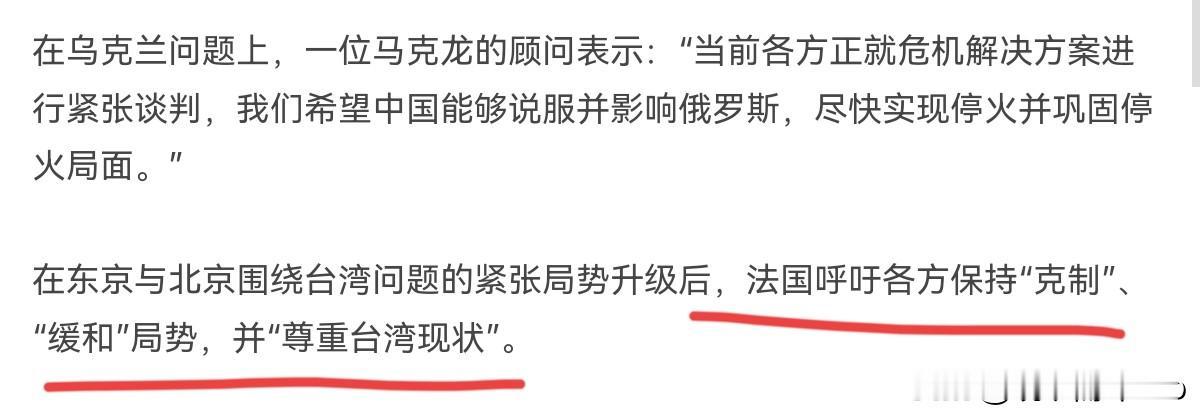 法国出来表态了!法国的口风也很硬!在中日纠纷持续之际,法国并没有支持我们的主张,更没有表态支持我们统一!11月27日,根据法新社报道,在马克龙即将访华之际,法国政府出来表态了。法国方面声称,围绕台湾问题的紧张局势升级后,法国呼吁各方保持克制、缓和局势,并尊重台湾现状。 很显然,从法国方面的表态来看,法国的立场就是和稀泥的立场,法国并没有对挑事的日本有任何的批评,也没有支持中国要求高市早苗撤回恶劣言论,更没有提及支持我们实现国家统一,而是要我们尊重所谓的台湾现状。但是,从我们的角度而言,所谓的尊重台湾的现状,是不是要我们永久不统一呢?如果是这个意思,这我们当然不能同意。 法国要求各方克制,难道法国不认为高市早苗的挑衅有严重问题吗?作为二战战败国,日本对战胜国进行军事挑衅,这不是破坏二战后的国际秩序吗?法国跟我们一样,同为二战战胜国,且都是联合国常任理事国,不应该担负维护二战国际秩序的责任吗?法国这一番表态,当然是不愿意得罪日本,更为深层次的原因可能是法国并不希望我们的统一发生。法国有自己的小算盘,但我们必然会实现国家统一,法国也会见证我们实现国家统一。