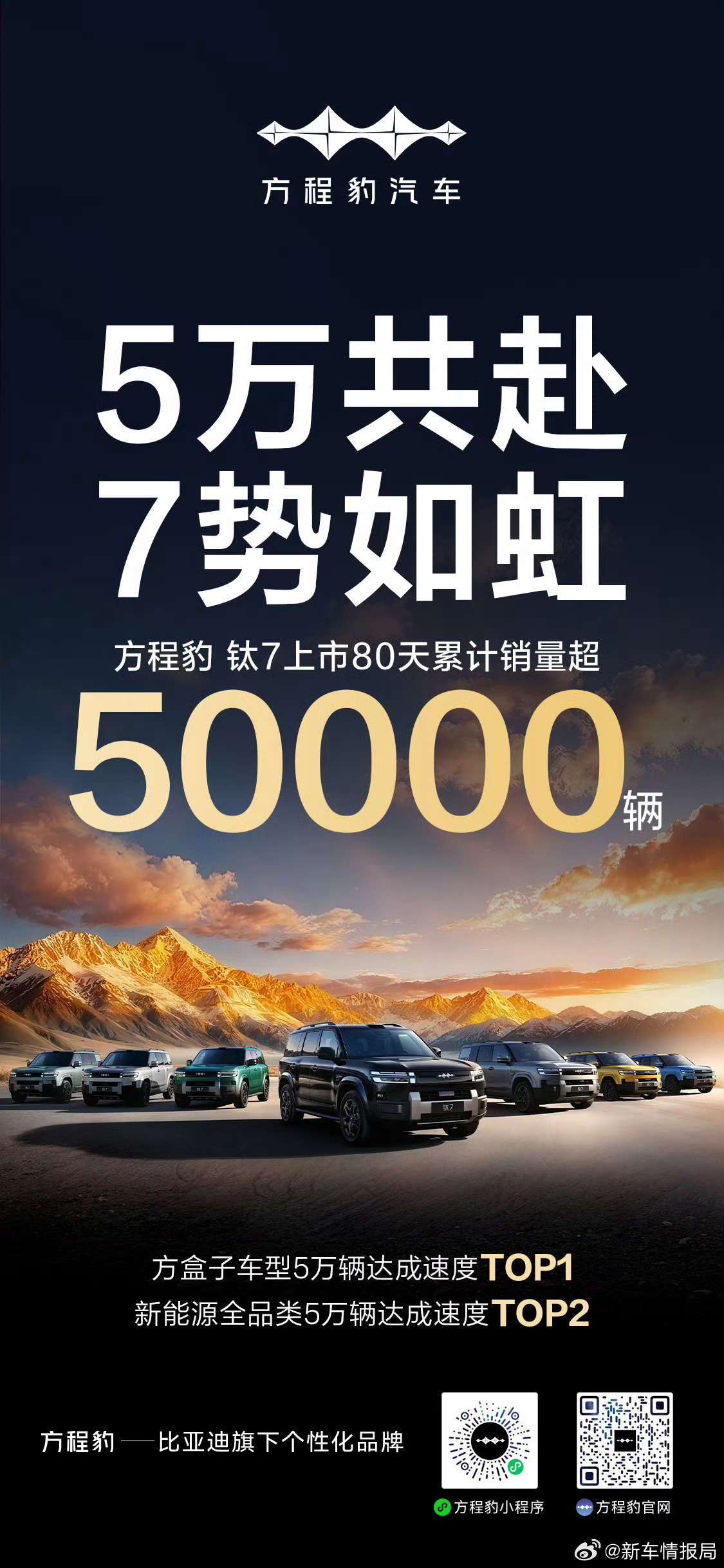 钛7上市80天累计销量超5万辆 截至11月26日,上市仅80天,累计销量已突破5万辆,展现了强劲的市场竞争力。新车情报局 方程豹钛7自9月9日上市以来,凭借其独特的方盒子造型、丰富的配置、出色的性能和性价比表现,迅速在市场上获得了消费者的广泛认可。