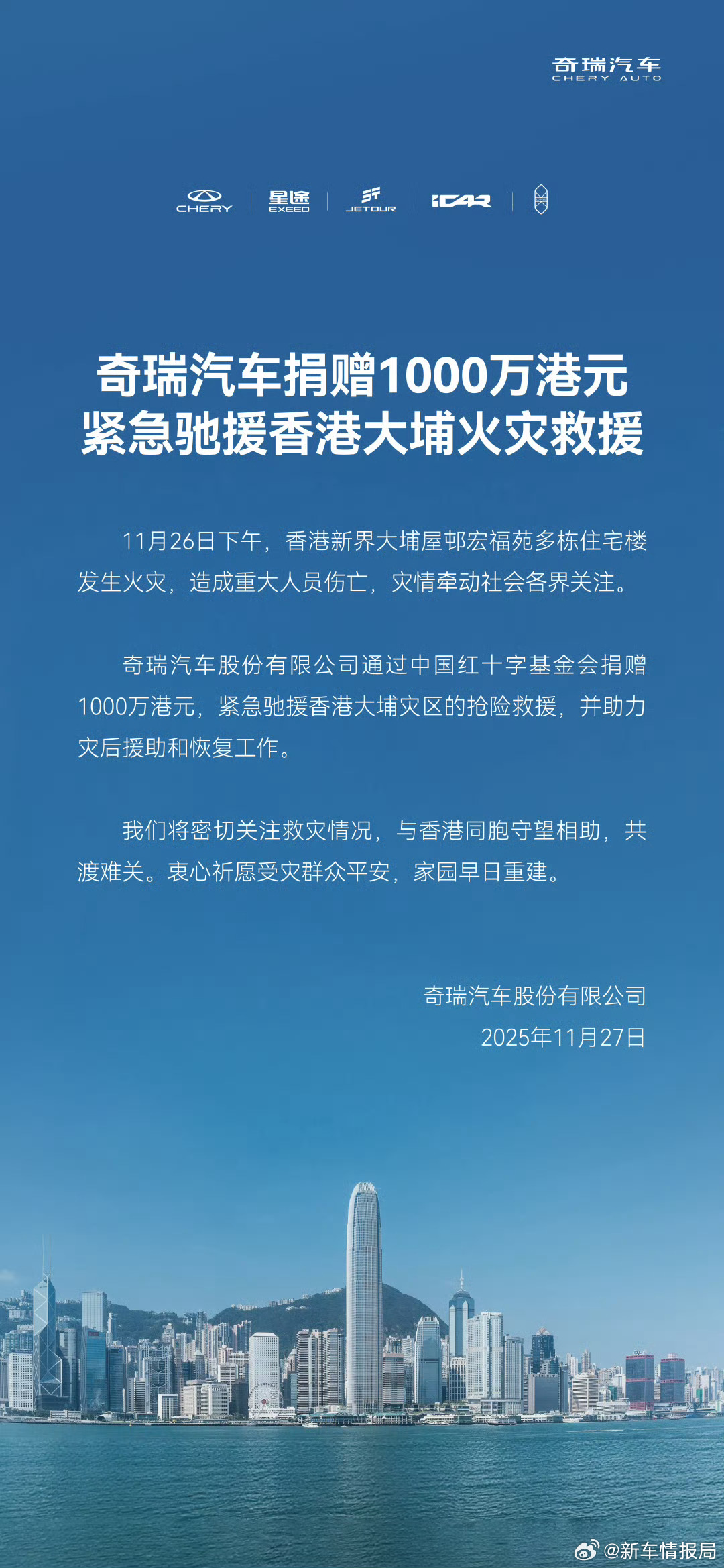 奇瑞汽车捐赠1000万港元驰援香港火灾多家车企捐款驰援香港 刚刚,宣布捐赠1000万港元紧急驰援香港大埔火灾救援 ,助力灾后援助和恢复工作。同时,奇瑞汽车也将密切关注救灾情况,与香港同胞守望相助,共渡难关。