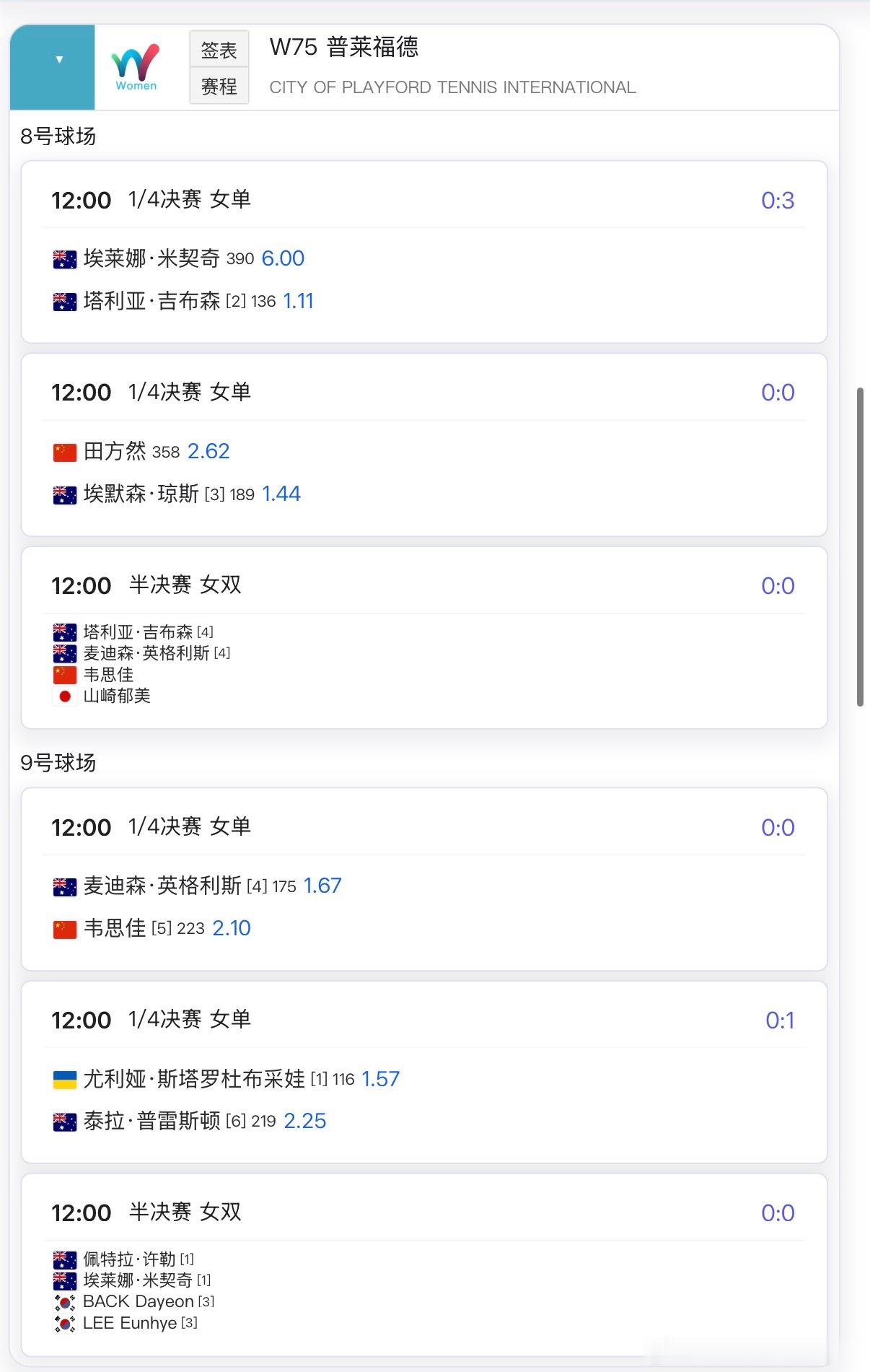 🔵W75普莱福德11月28日赛程💃🏻女单1/4决赛🇨🇳韦思佳vs🇦🇺英格利斯🇨🇳田方然vs🇦🇺琼斯💃🏻💃🏻女双半决赛🇨🇳韦思佳组合出战网球talking大会 丨中国网球