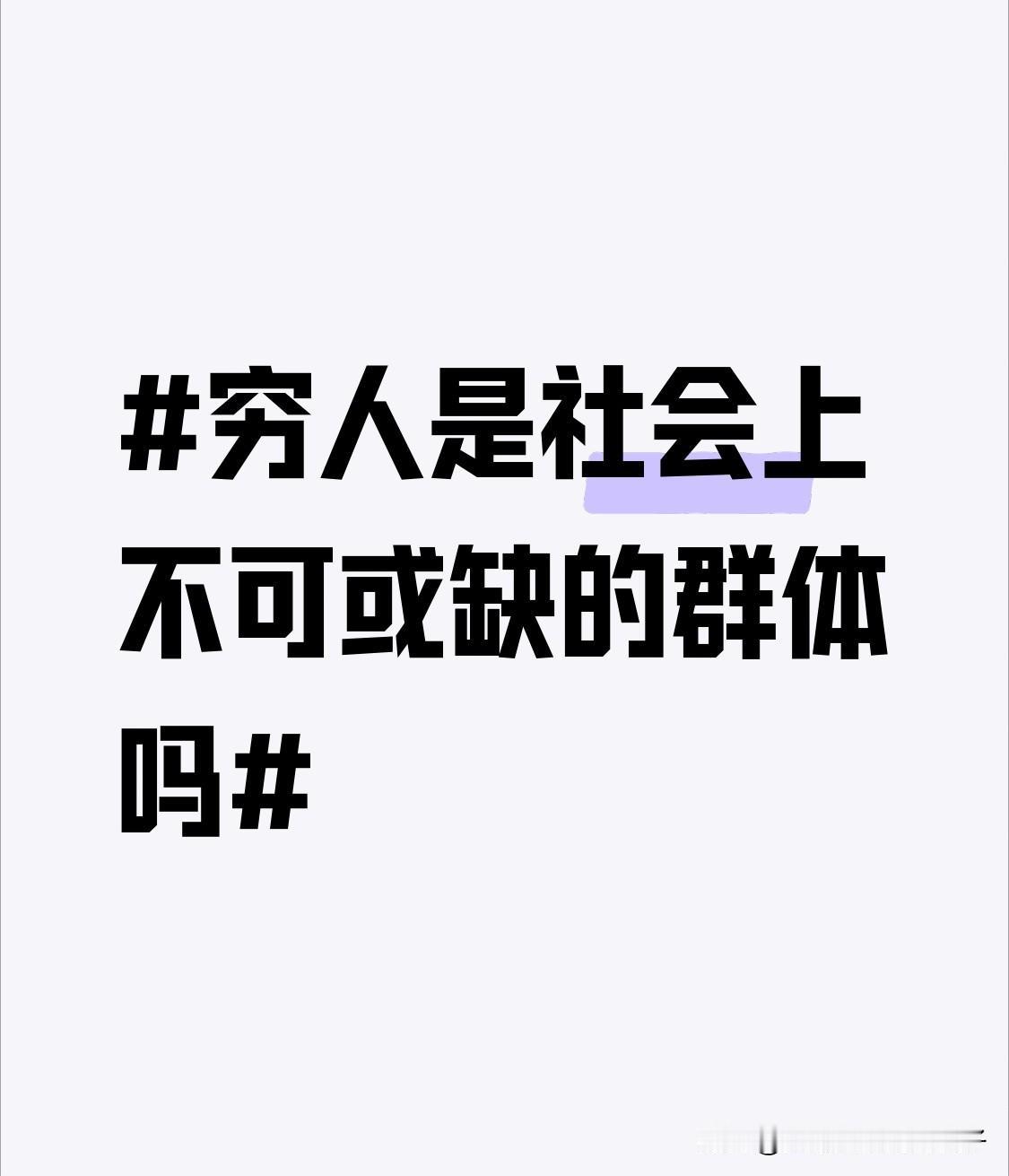 穷人绝对是社会不可或缺的群体。他们虽生活在贫困边缘,却有着独特价值。 穷人靠勤劳双手创造财富,像工地的农民工、街边的小商贩,没机会接受高等教育,却有丰富生活经验和实用技能。面对困境,他们坚韧乐观,不被生活打倒。而且,穷人更具同情心,因自身经历能理解他人苦难,会向更困难的人伸出援手。 社会底层的他们,为社会稳定发展默默付出。社会不该忽视他们面临的困境,应给予更多帮助和支持,让他们有改变命运的机会,共同构建公平和谐的社会。
