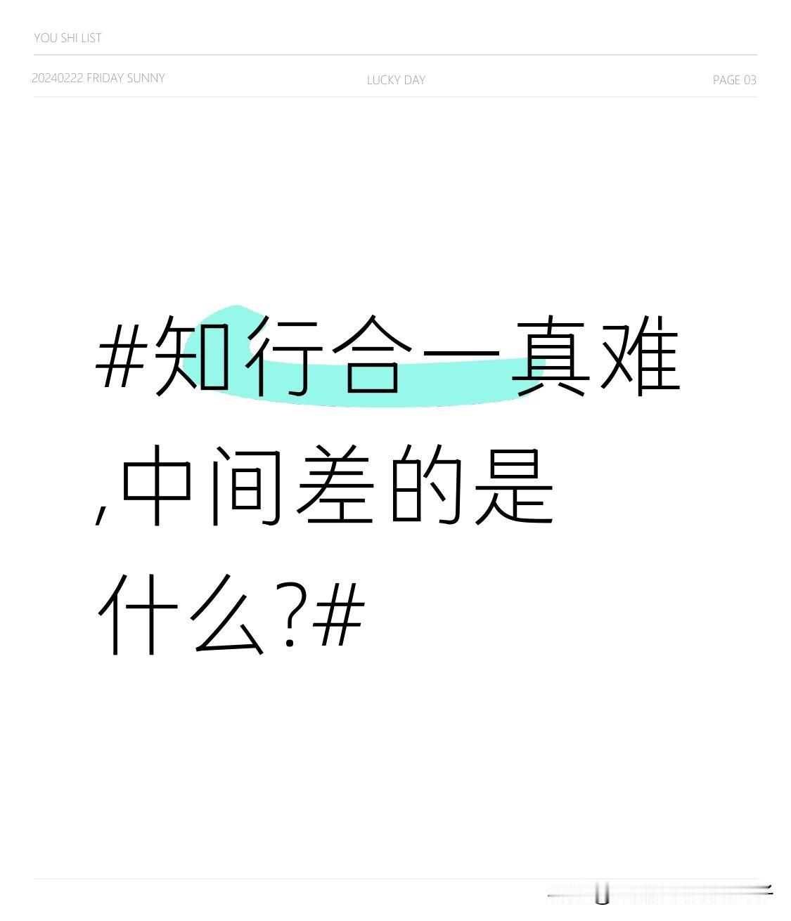 知行合一真难,中间差的是什么? 知行合一真难,差的东西还挺多。从教育方面看,我们从小接受的多是重理论轻实践的应试教育。学数学会算微积分,却不会规划日常开支;学写作能背写作结构,却写不出动人情书。这种教育模式让我们形成“读书多问题自解”的错觉,导致眼高手低。 另外,认知偏差、情绪拉扯、行动阻力和反馈缺失等也影响着知行合一。认知偏差会让我们对知识理解有误;情绪一来,理智就容易下线;行动时的各种阻碍会消磨我们的动力;而缺乏反馈又难以让我们调整行动。要做到知行合一,得打破这些阻碍才行。