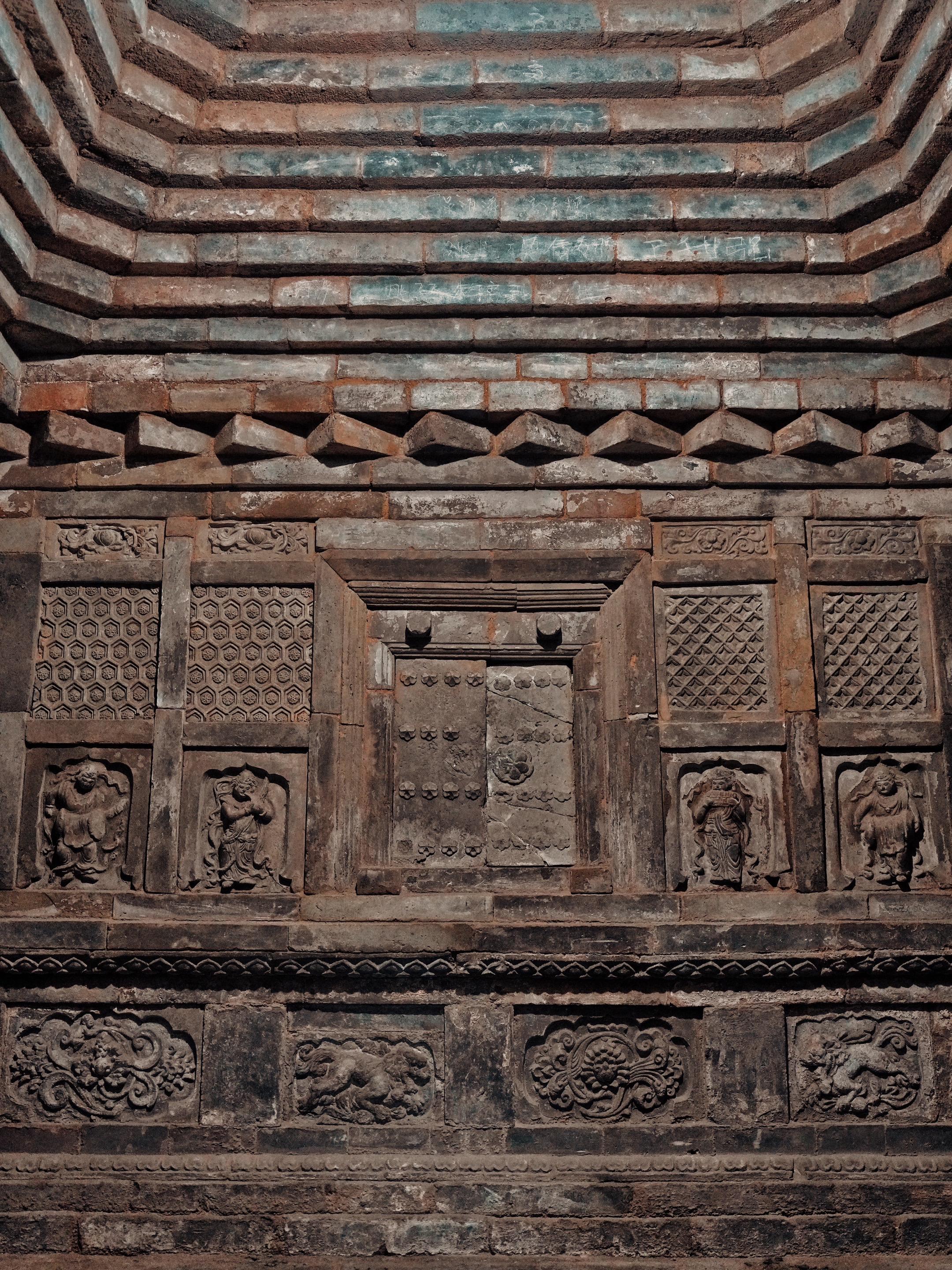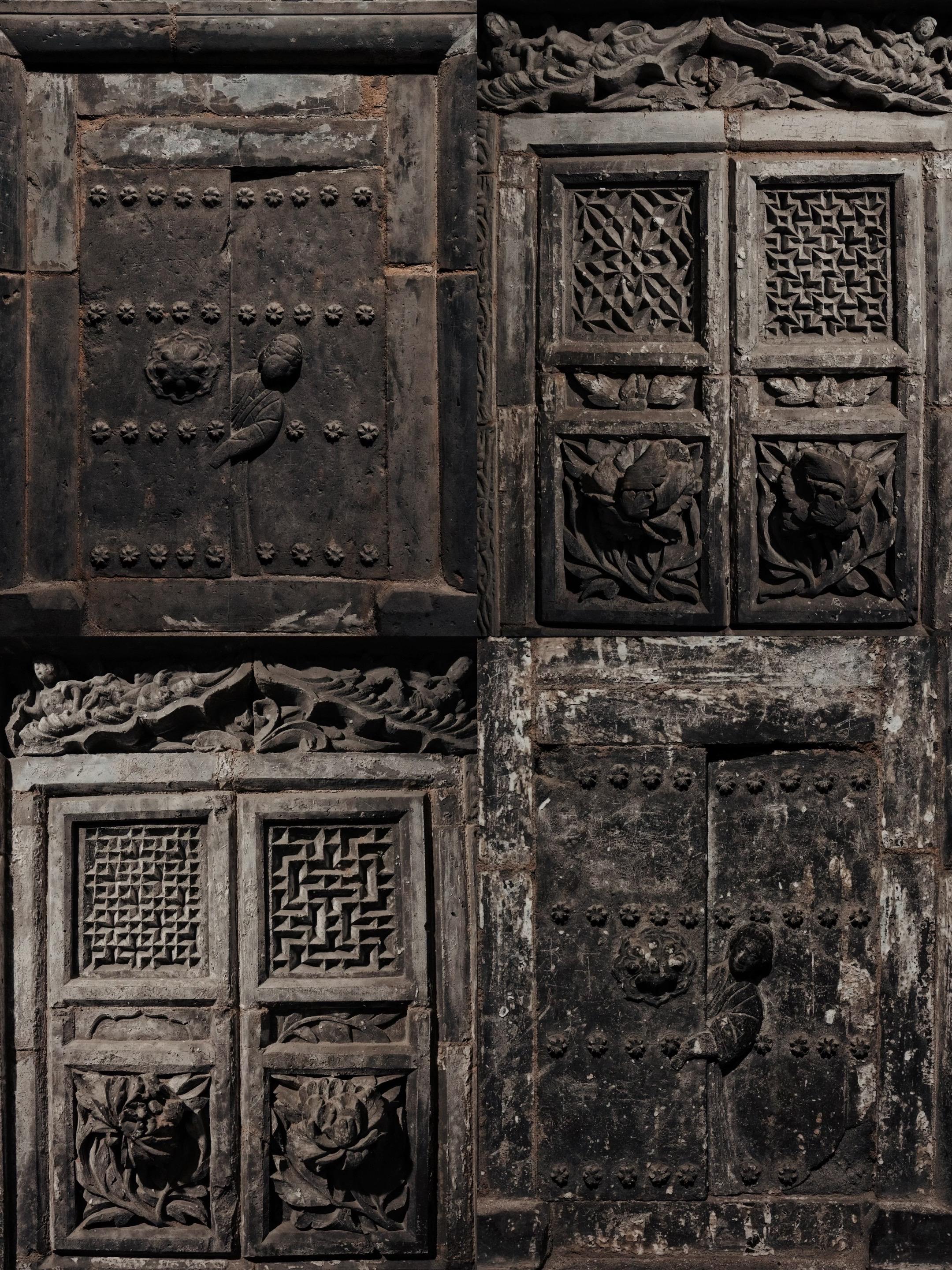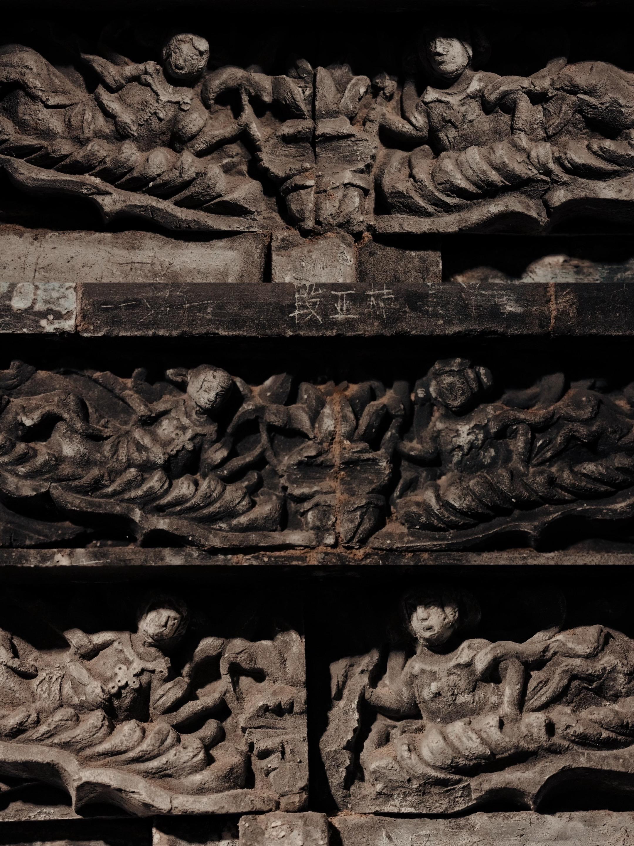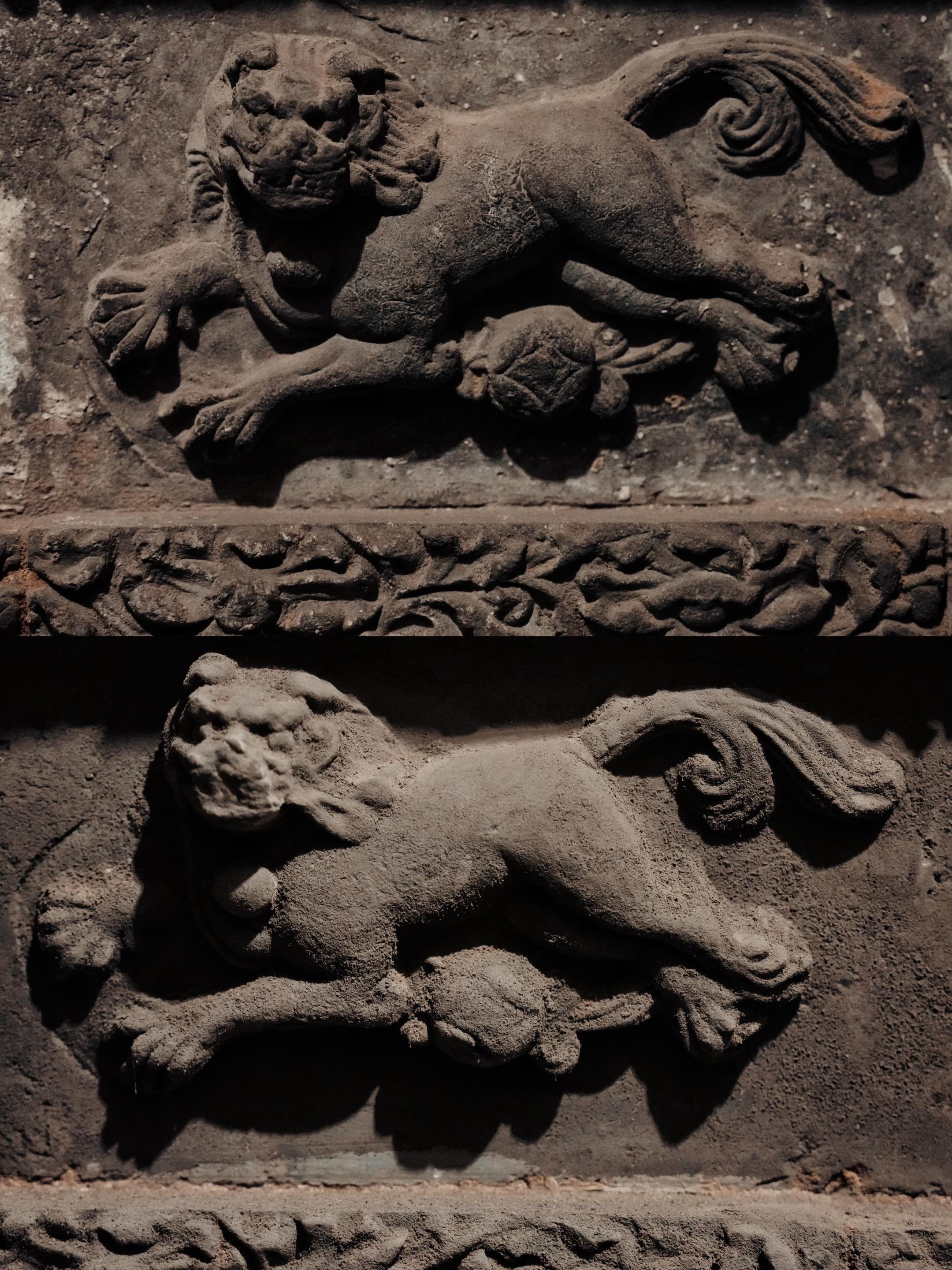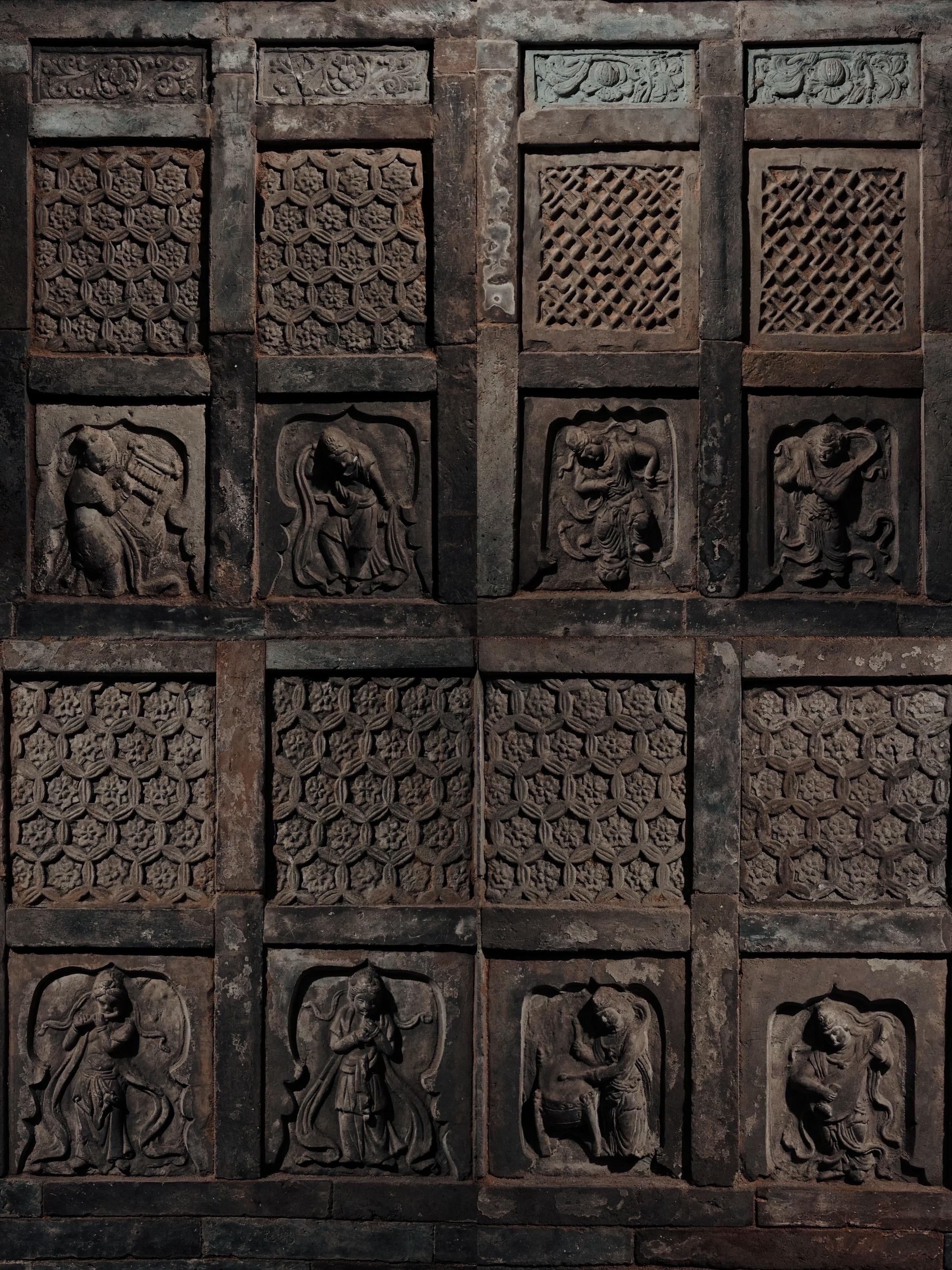 ✔️砖雕:墓室是仿木结构,有天女散花+麒麟送子,还有牡丹+