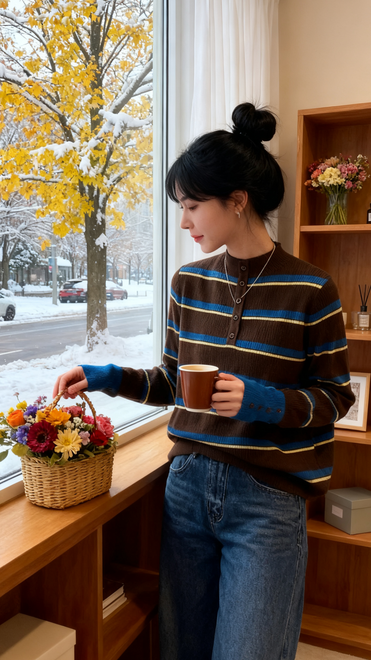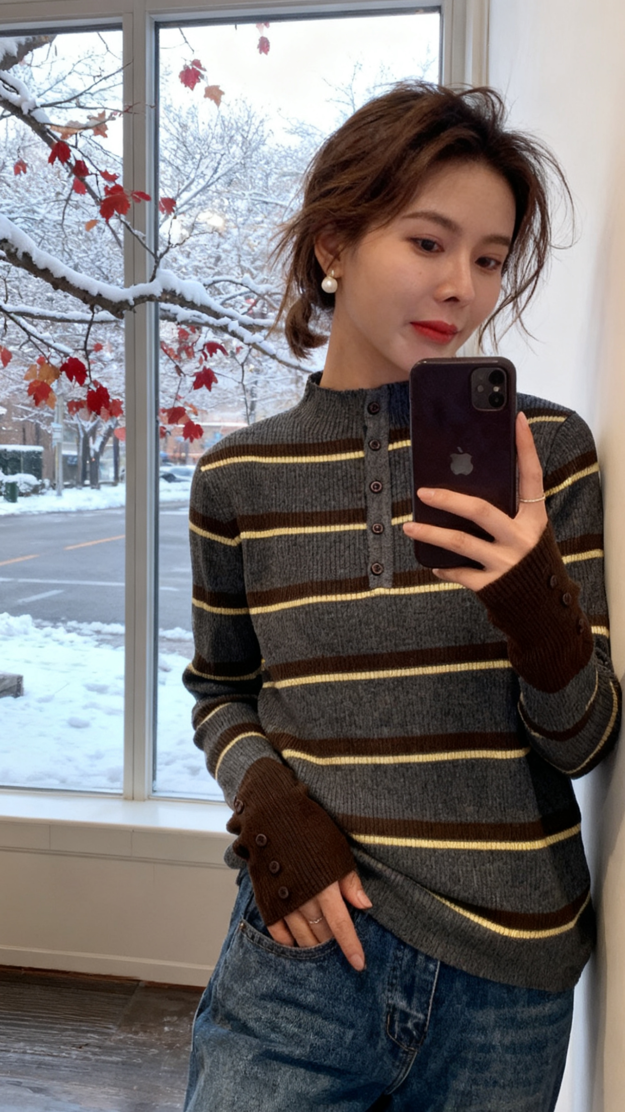 冬季小立领设计长袖百搭修身撞色条纹针织衫女针织衫 时尚街拍穿搭 治愈 美女街拍穿搭