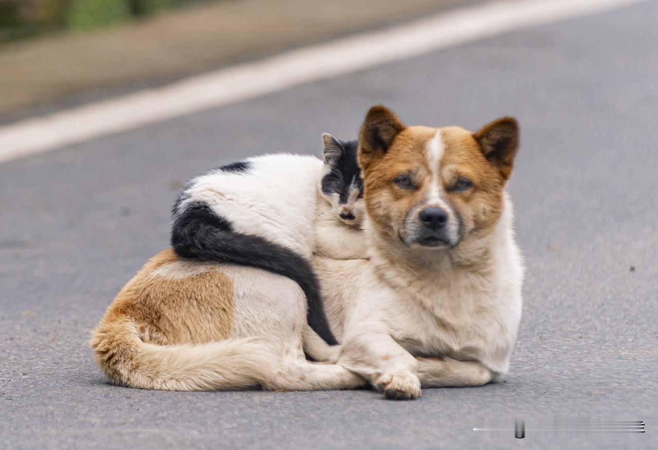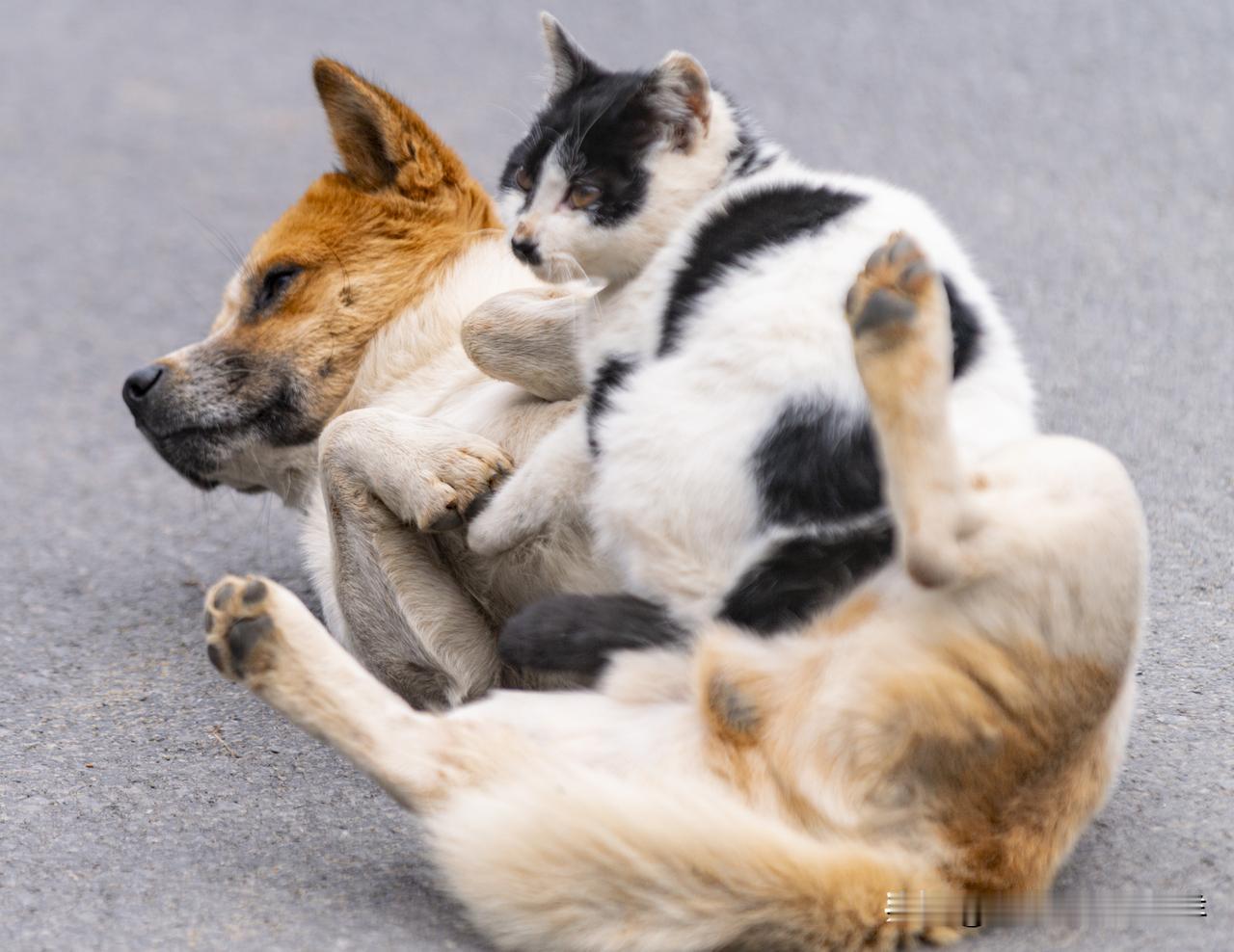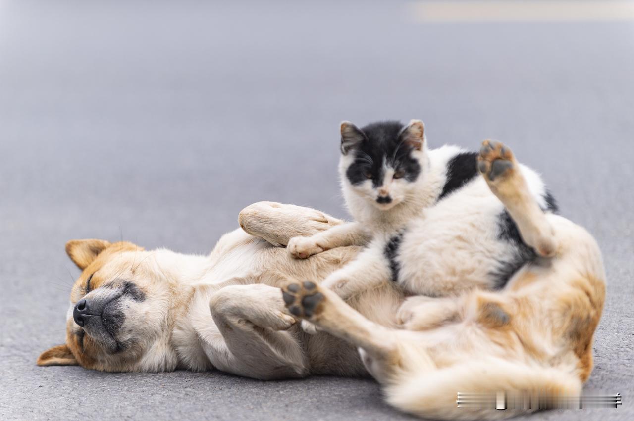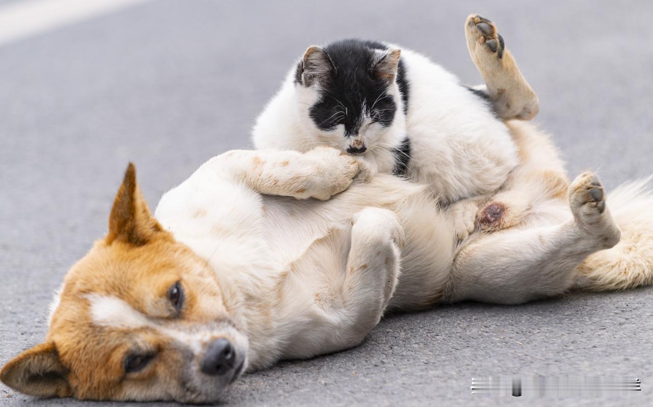 分享我这周有趣的事:《“猫犬和平协议”现场实录》 街头活捉一对“反物种联盟”成员—— 大黄(犬籍):“本来只想躺平晒肚皮,哪想到被这黑白团子当成了暖水袋,还带自动踩奶功能的那种。” 奶牛(猫籍):“这床软和,还自带呼吸起伏,比水泥地强八百个猫窝。(踩奶ing)” 路过的我:请问二位是怎么做到把“马路当炕头”的? 大黄(眼皮都没抬):“熟人局,主打一个松弛。” 奶牛(埋脸):“别吵,本喵在给狗皮沙发做质检。” 建议列入《城市流浪动物的幸福生活指南》—— 核心要义:找个能处的搭子,在哪都是大床房😼🐶