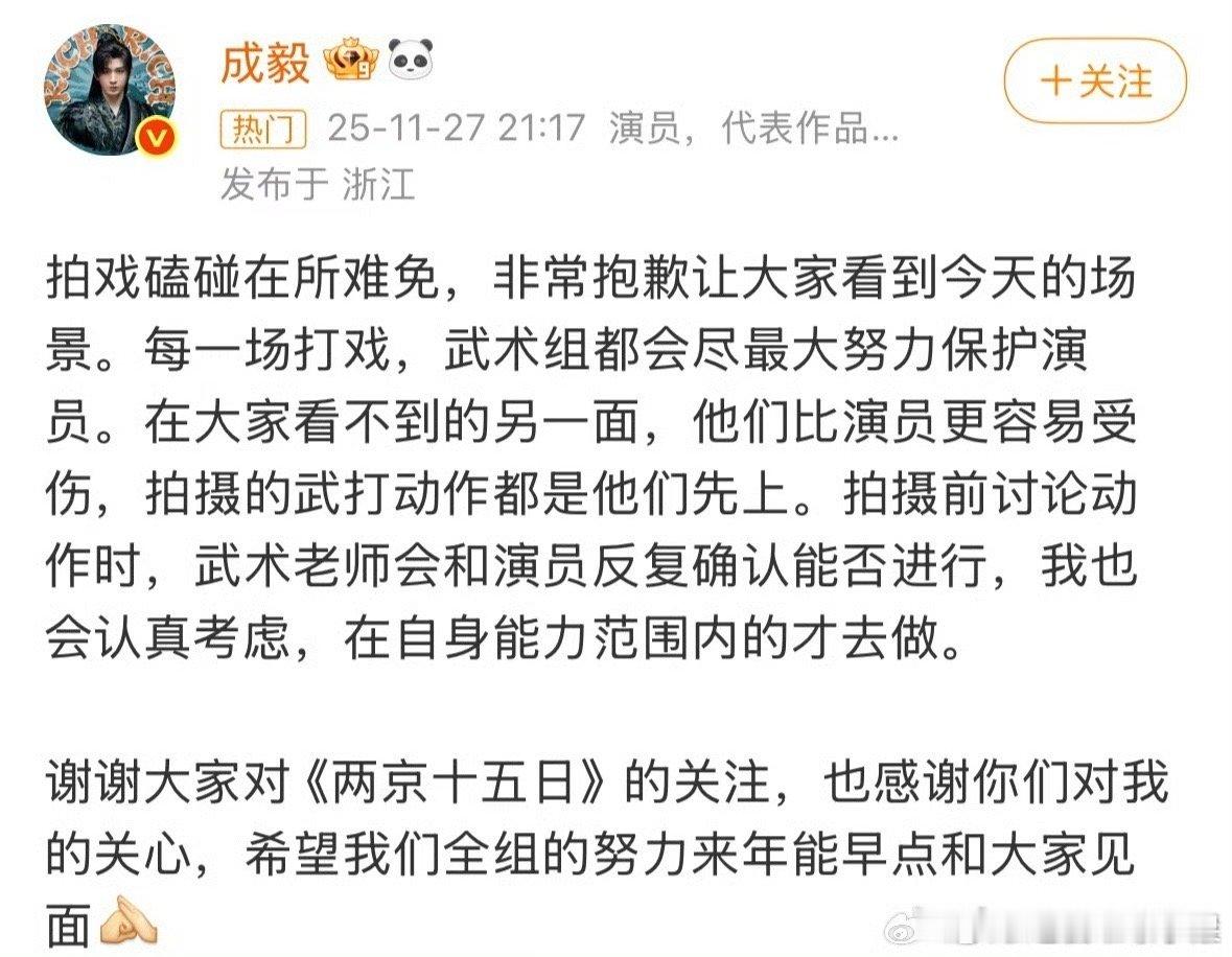 成毅回应了自己受伤的事情 他表示拍戏受伤是难免的 希望大家不要担心 成毅又受伤了