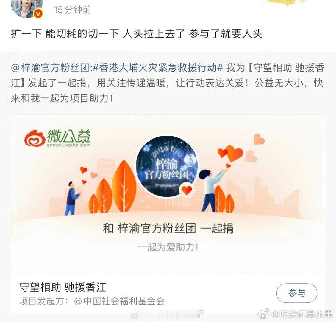 梓渝大粉号召其他粉丝为香港火灾捐款好正能量啊香港捐款栩你渝生后援会捐款