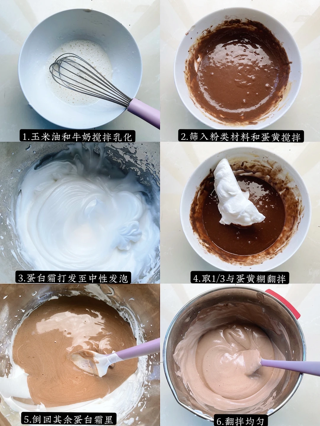 可可粉10g 低筋面粉70g 玉米油40g 牛奶80g 鸡蛋4个 细砂糖70g 香草精2滴