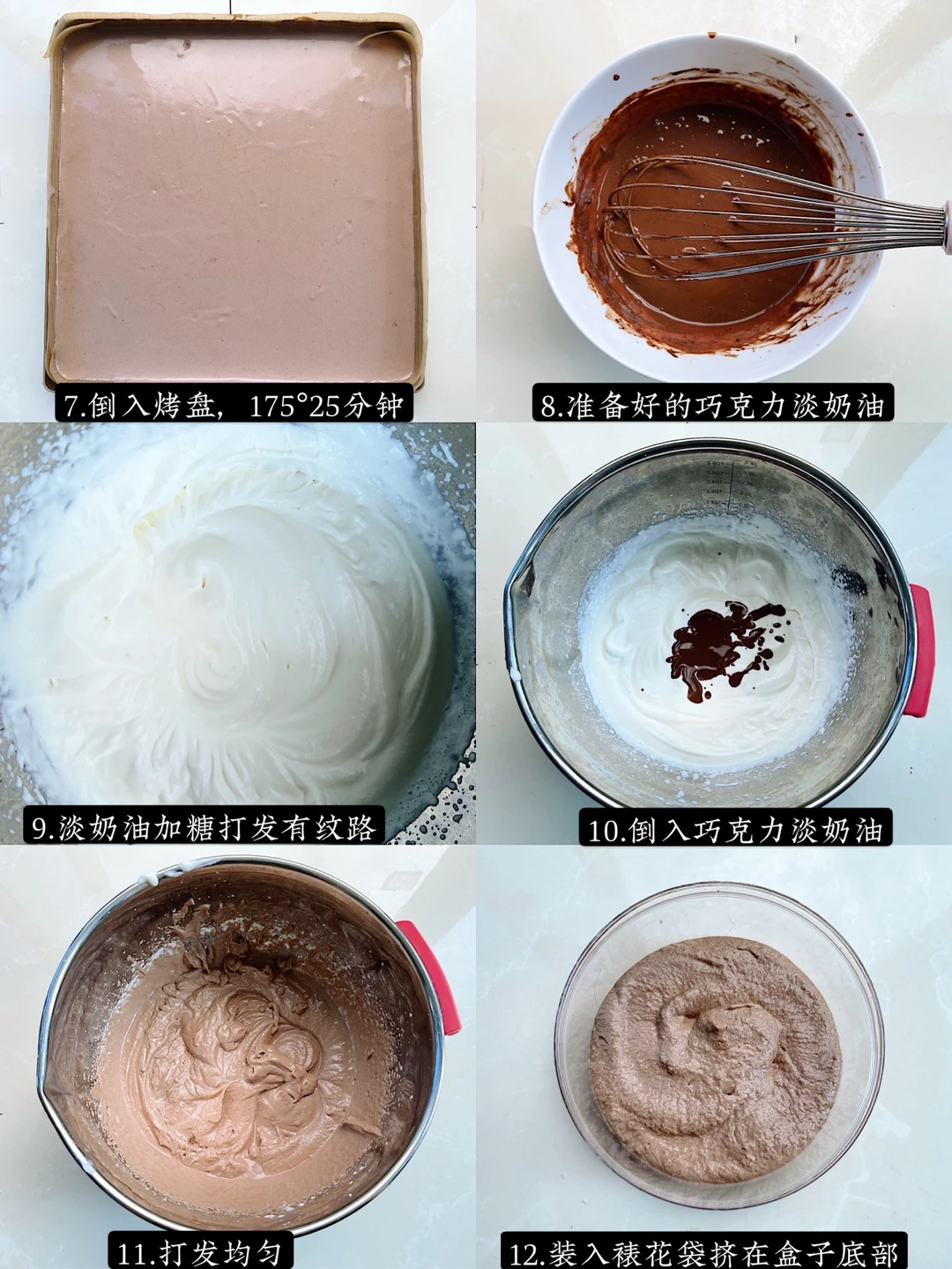 3️⃣取1/3的蛋白与蛋黄糊翻拌均匀以后倒回其余的蛋白霜里翻拌均匀,倒入烤盘里,175度25分钟。烤好的蛋糕胚分成盒子的大小。