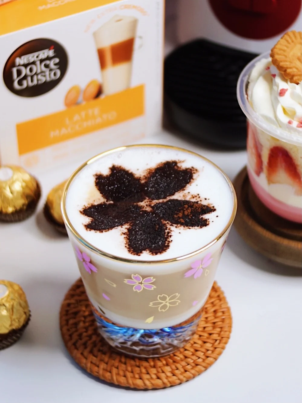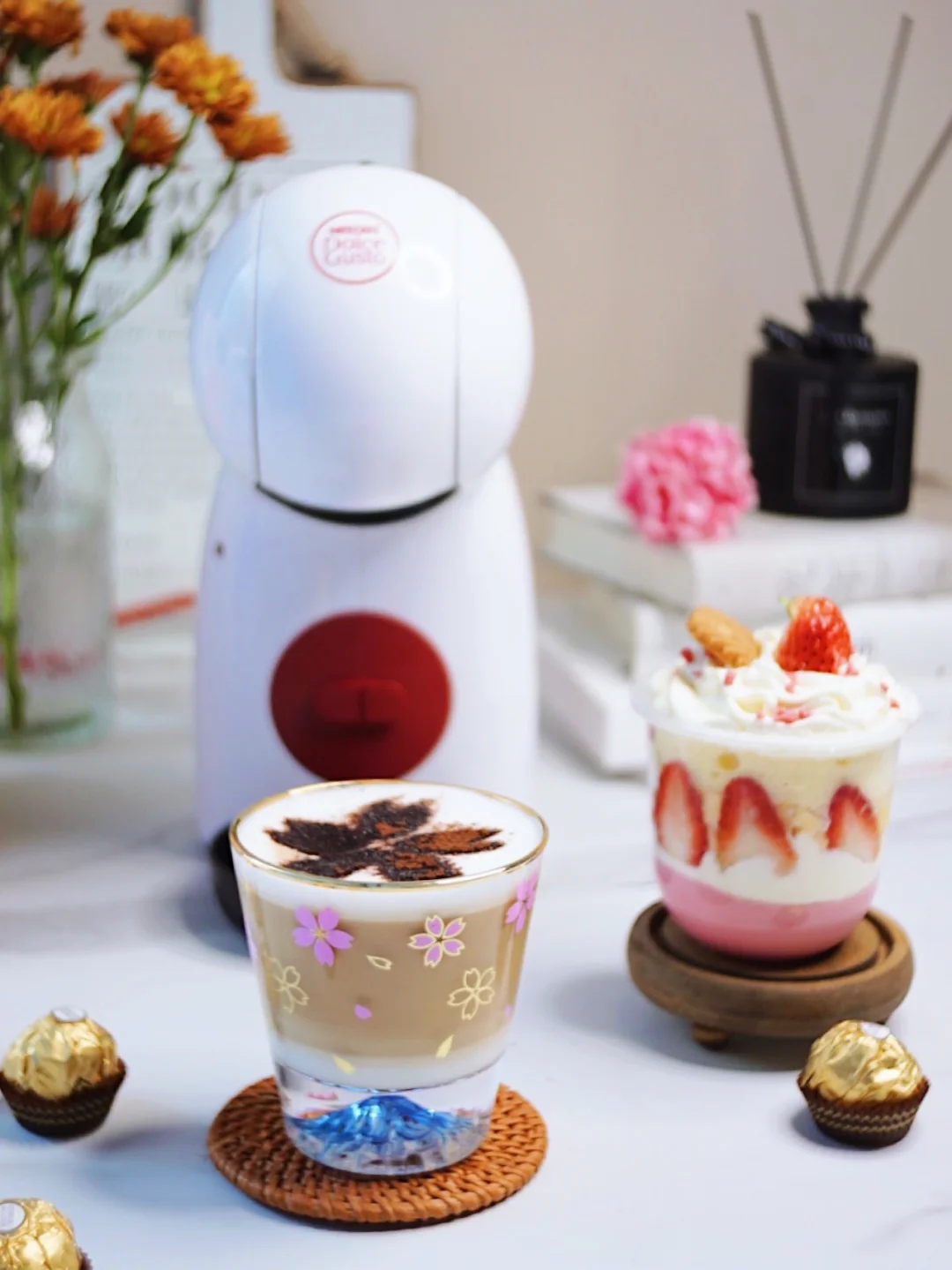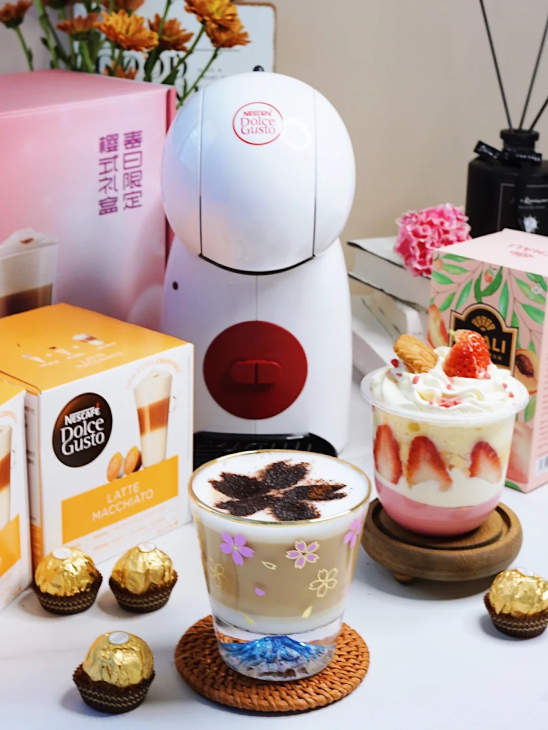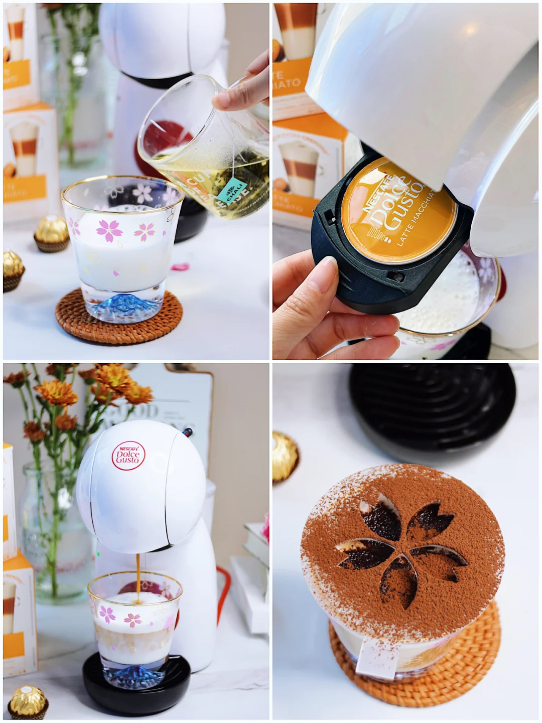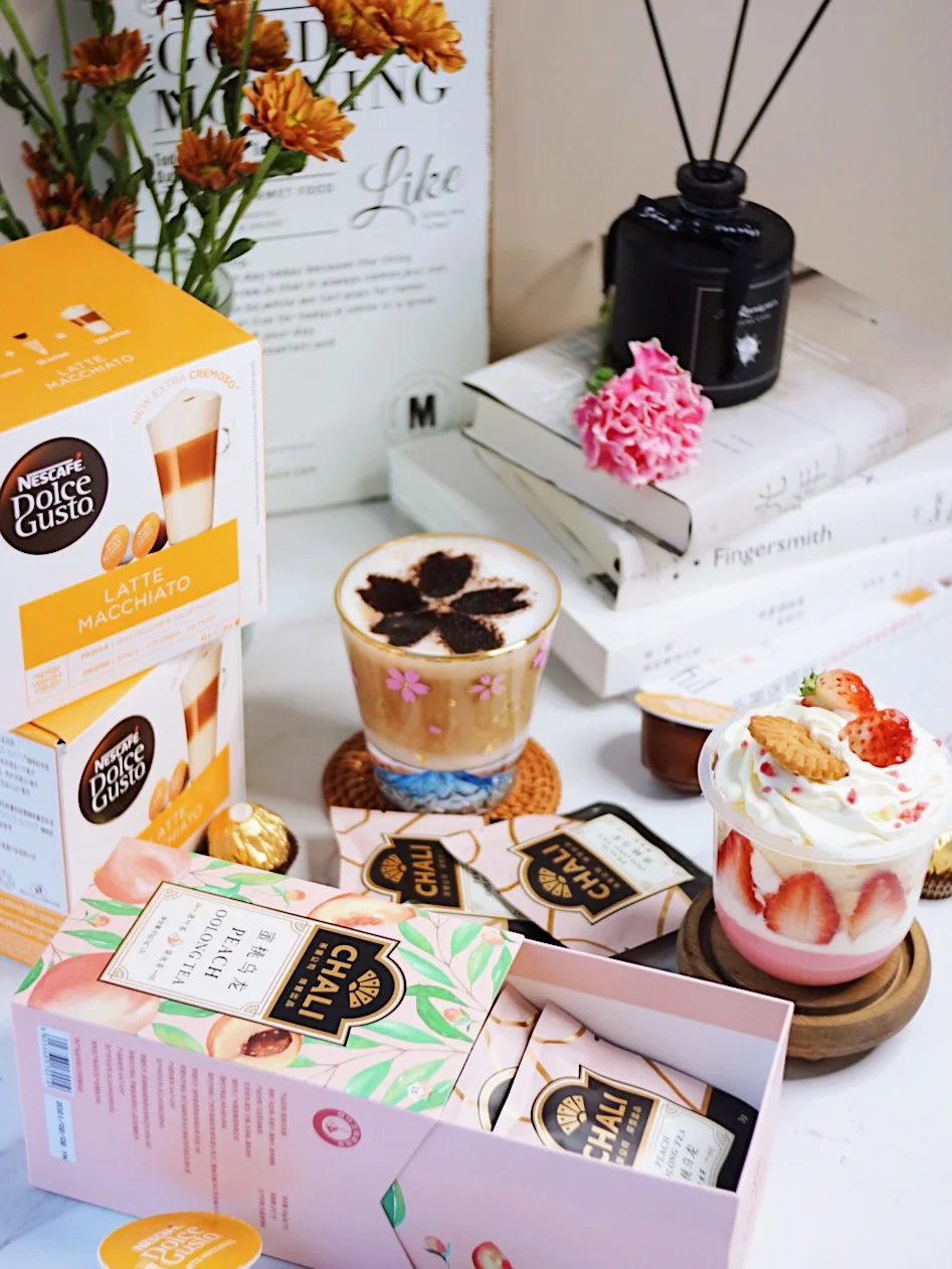 🔅我正好是前两天入手的,赶上了多趣酷思新出的“限量樱式少女心茶里套组”,不仅有2盒多趣酷思拿铁玛奇朵胶囊,还有CHALI茶里蜜桃乌龙茶包、樱花杯、樱花模具、樱花贺卡