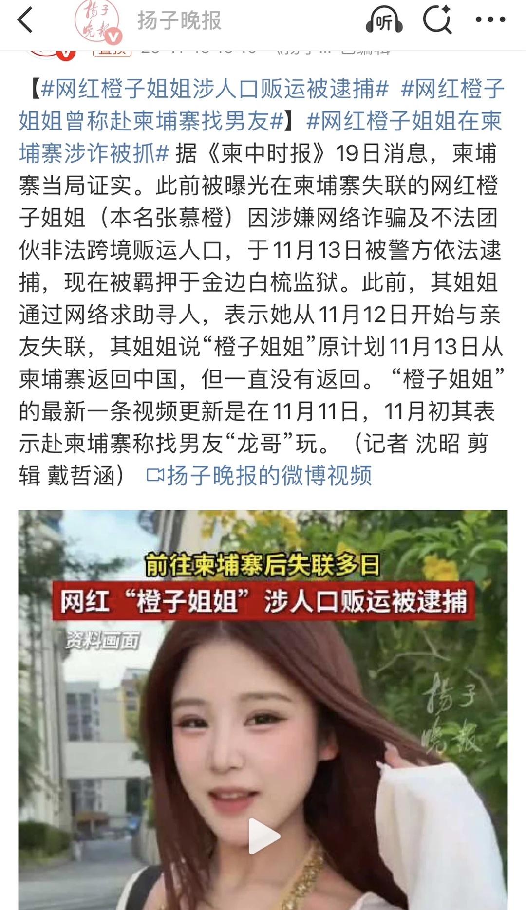 女网红”橙子姐姐”在柬埔寨被捕涉网络诈骗&跨国人口贩运 《柬中时报》接获金边初级法院调查法官羁押令,张慕澄(26岁),中国籍,于11月13日在金边被捕。法院指控其在2025年10月至11月期间参与多起网络诈骗活动,并涉嫌与不法团伙合作,从事非法跨境人口贩运犯罪。