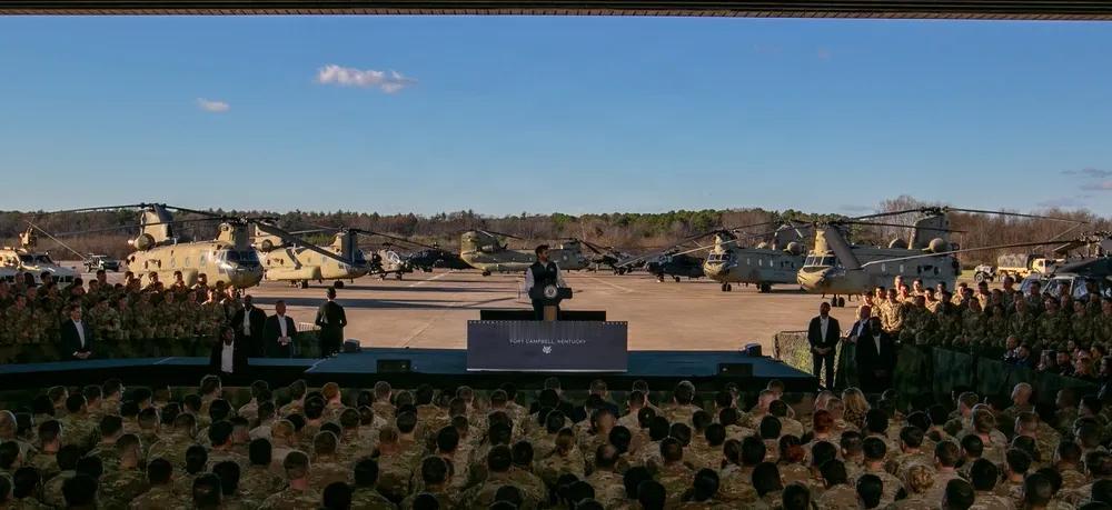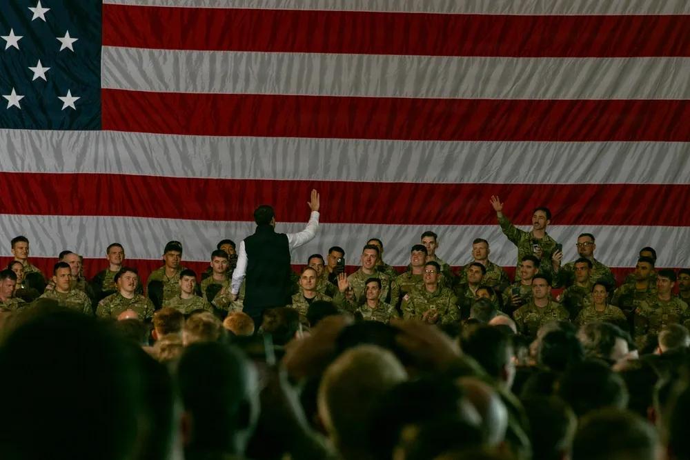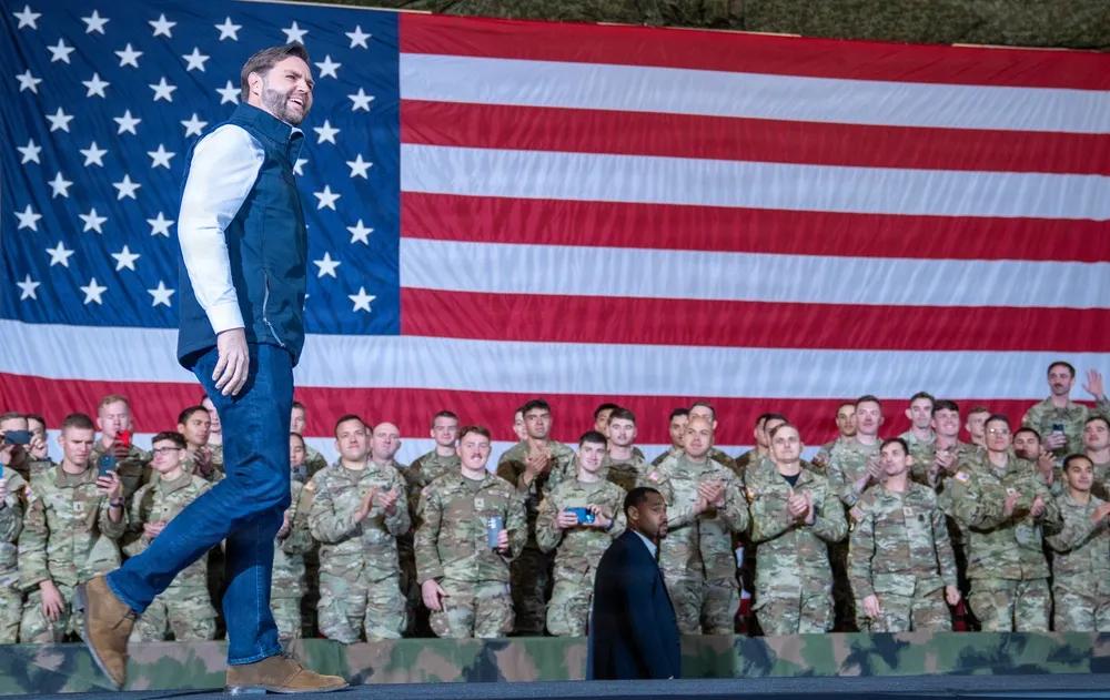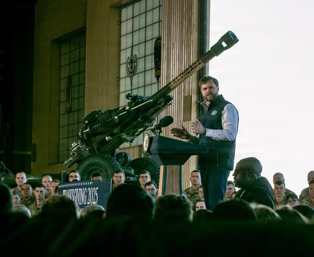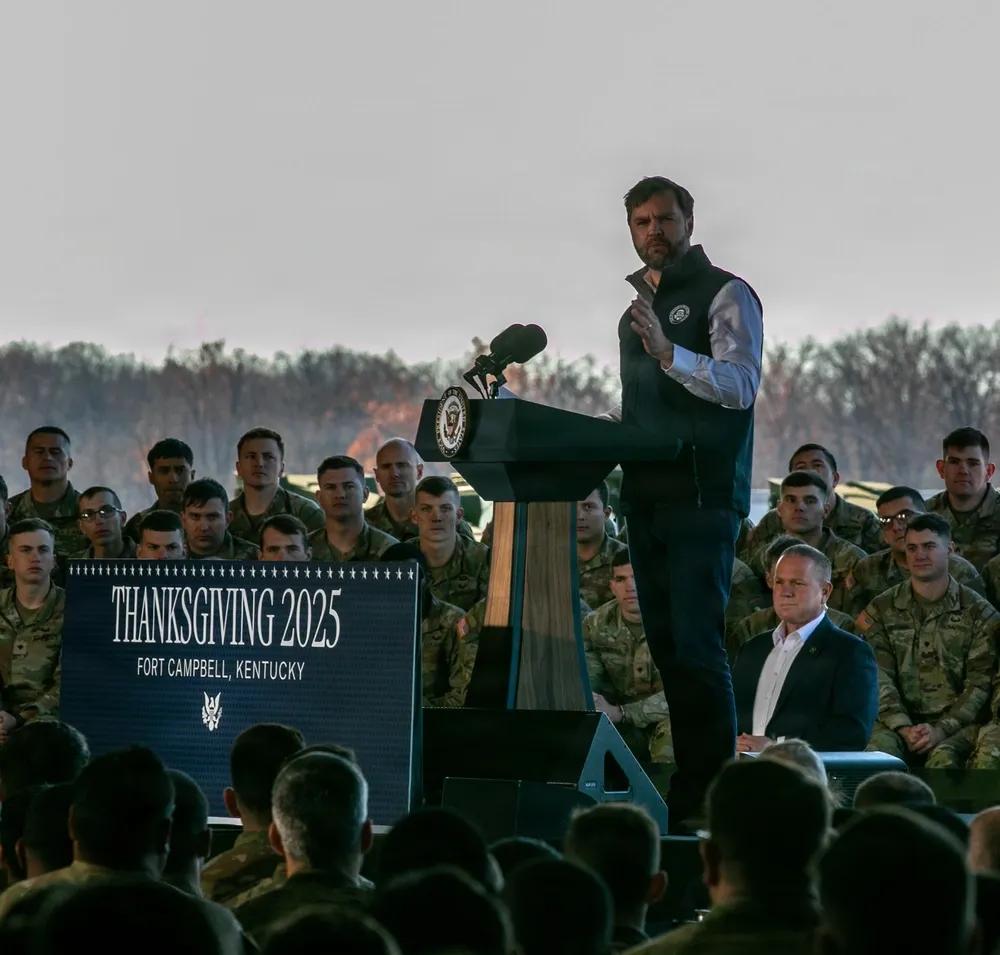 2025年11月26日,美国现任副总统JD·范斯(JD Vance)在肯塔基州坎贝尔堡向第101空降师(空中突击)士兵发表演讲。美国副总统JD·范斯访问了第101“尖叫鹰”部队士兵,以庆祝感恩节假期,并表达他对他们在国内外保卫美国利益的支持。