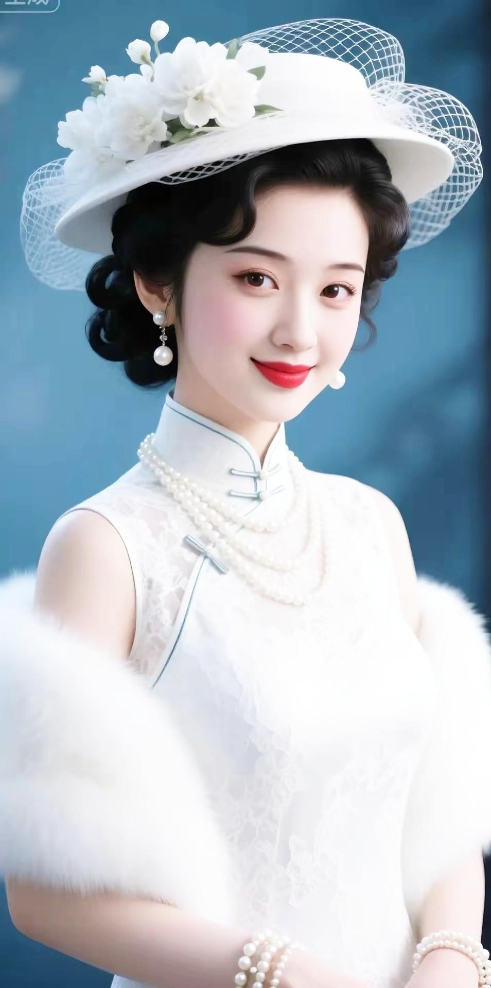 惊艳的古典美女,红唇微笑,头戴花饰,优雅动人。