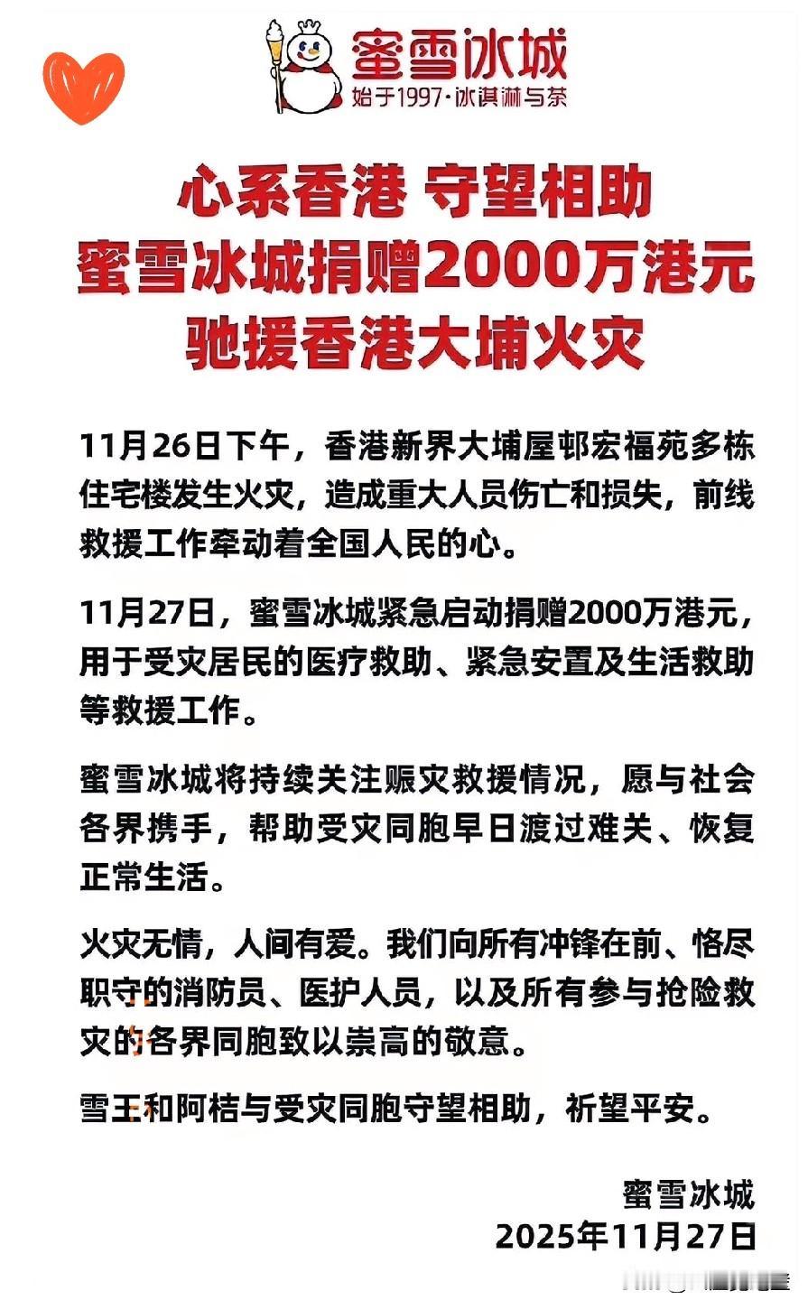 这次香港火灾, 马云捐款3000万我不意外,安踏捐款3000万我不意外,腾讯捐款1000万我也不意外,让我感到意外的是连做奶茶的蜜雪冰城也捐款了2000万。 这次香港火灾遇难者和受伤人员那么多,各大企业纷纷捐款,真的很让人意外的是蜜雪冰城也捐了2000万。 蜜雪冰城因为售价便宜,经常被网友调侃,说它是“雪王”, 本来对它的印象一般,此次捐款让我对它的印象分又上升了不少,不得不说,还是有良心企业的。 你说对吗?