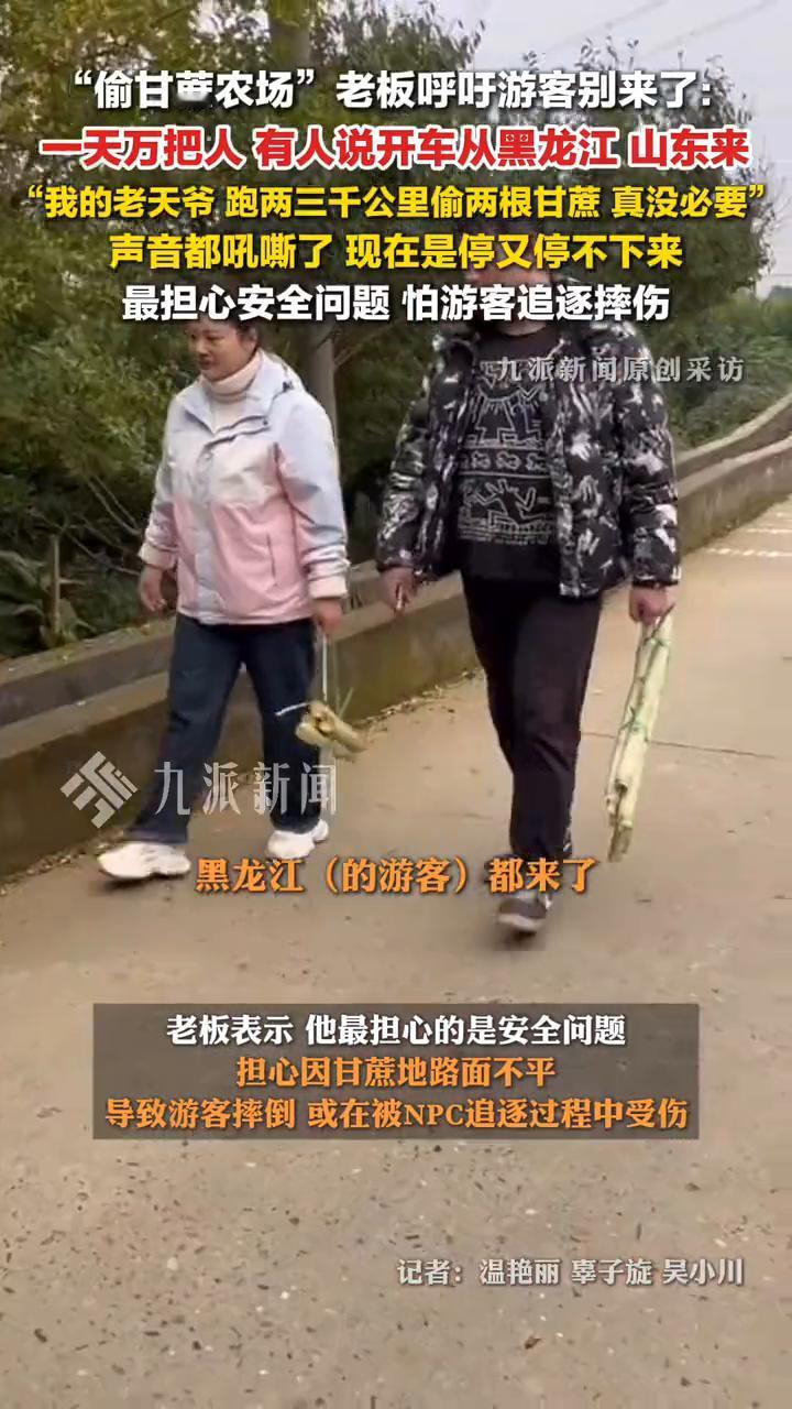 "偷甘蔗农场"老板呼吁游客别来了:一天万把人有人说开车从黑龙江山东来,"我的老天爷跑两三千公里偷两根甘蔗真没必要"。 九派新闻。 近日四川眉山一甘蔗地推出"9.9元偷甘蔗"活动,若被NPC"逮到"则每根甘蔗收费15.9元。 记者:温艳丽、子旋、吴小川。 黑龙江(的游客)都来了,11月24日老板告诉九派新闻,上周末每天有近万人来体验"偷甘蔗",顾客越多自己亏得越多已增收2.99/人入场费。 老板表示他最担心的是安全问题,担心因甘蔗地路面不平导致游客摔倒或在被NPC追逐过程中受伤。 我觉得没得必要,几千公里路你来偷两根甘蔗。