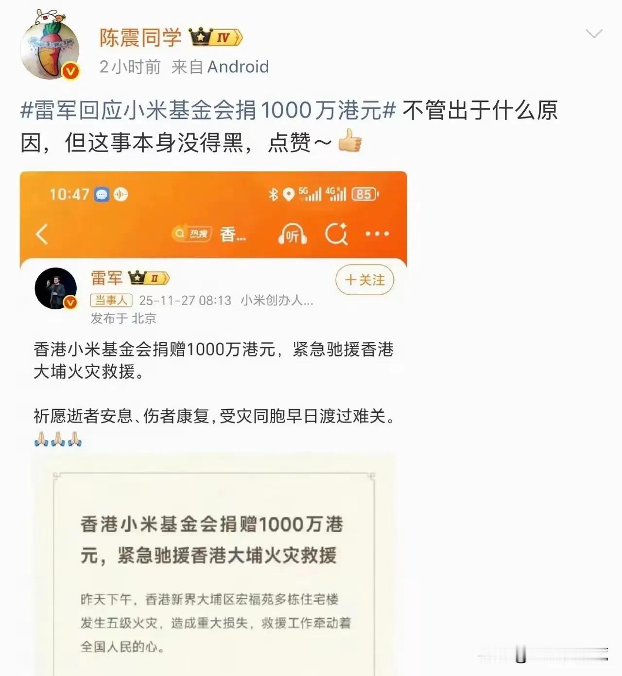 现在全网最难过的人,大概就是雷军吧。 香港有难,香港小米基金会立马捐1000万港元,雷军还发了动态,愿受灾同胞早日渡过难关。 没想到,这一善举却招来了很多人的阴阳怪气,一些人一拥而上,从各个角度蛐蛐人家心思不纯,还有个大博主说人家:不管出于什么原因,捐款本身还是好的… 我嘞个去,这是什么话,啥叫不管什么原因呢,言外之意就是人家还有别的原因呗。 咱就不懂了,做个好事都有人说风凉话,在灾难面前说这样的话,脸不会红吗?