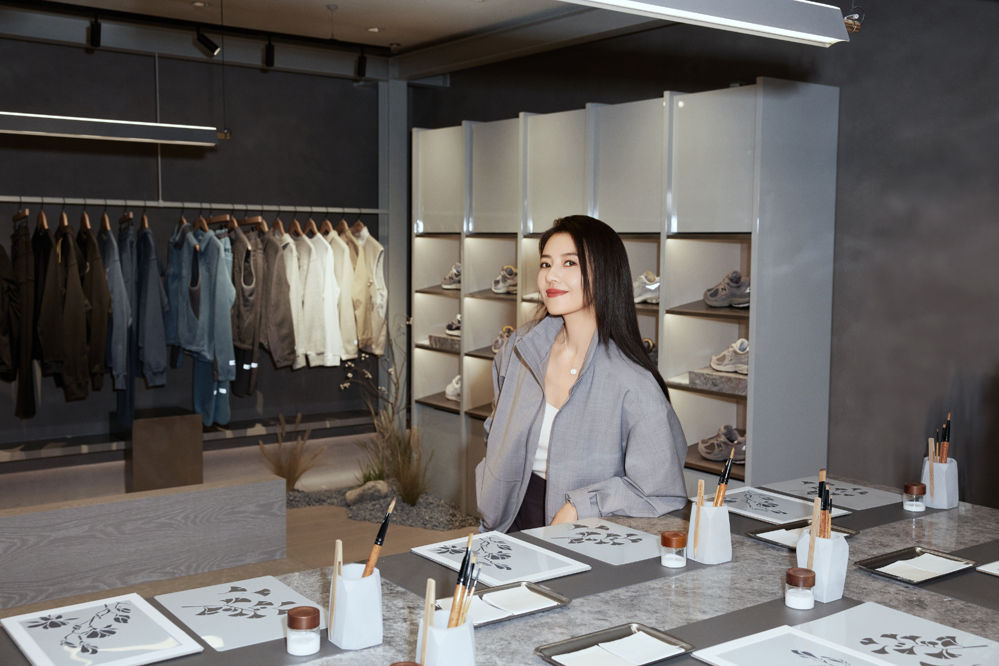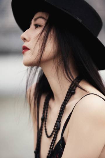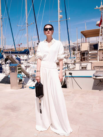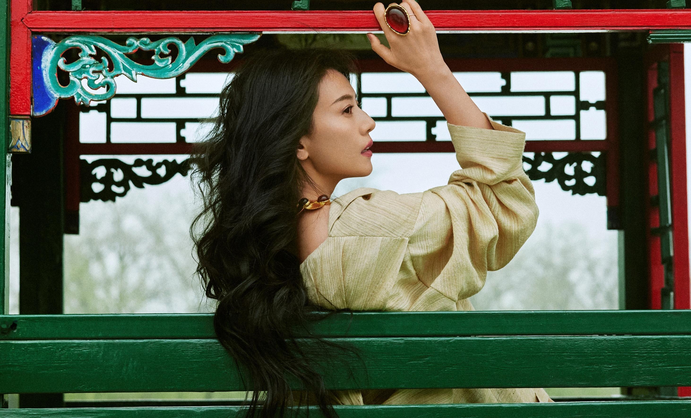 一身穿搭简约又高级,黑色西装搭灰绿百褶裙,红门竹景衬得优雅大气。