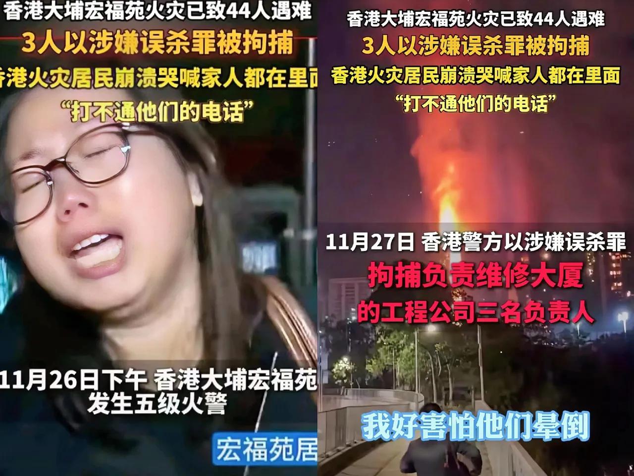 现在最心慌的人,估计就是被抓的那3个负责人了! 警方觉得,就是他们的严重疏忽,才让火势一下子蔓延开,造成这么重大的伤亡,44人遇难,45人受伤,这数据看着揪心又痛心呐! 话说这么大的工程,香港政府没有相关部门管理监督的吗? 这应该引起国内有关部门重视!对国内的高层建筑结构用的材料要进行调查监督!这个教训太深刻了!