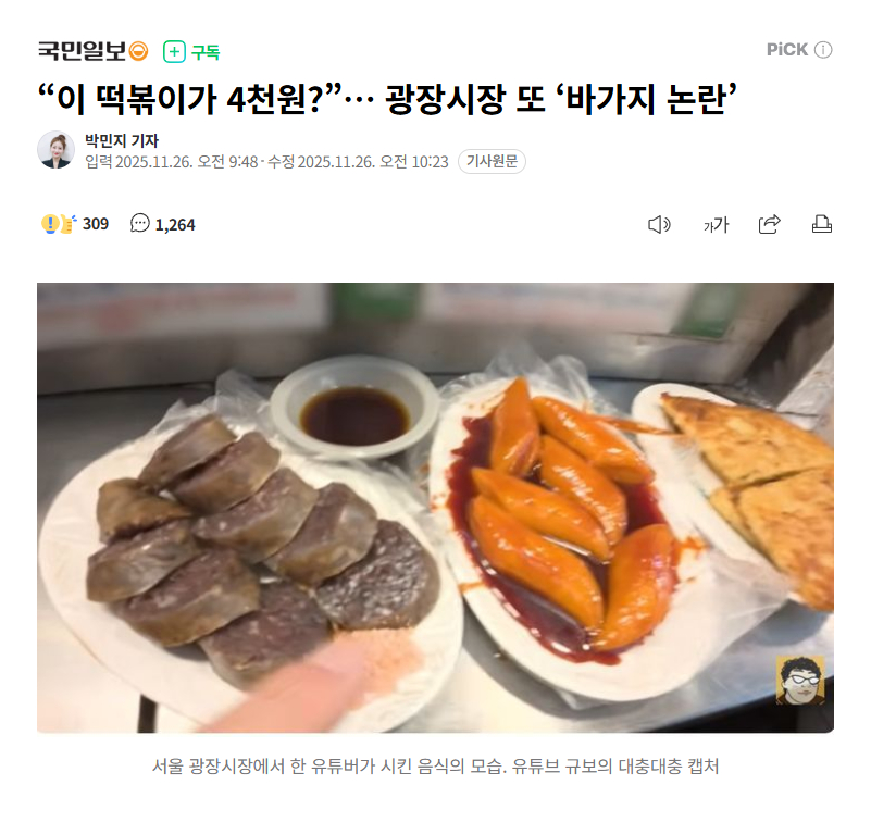 【韩国广藏市场再陷"宰客争议",6块炒年糕要4000韩元】海外新鲜事热点现场 因"耍心眼宰客"而卷入巨额赔偿诉讼的首尔广藏市场,再次引发了宰客争议。最近,一位到访该市场的Youtube博主上传了一段视频,内容显示市场上销售的9块米肠售价7000韩元、6块炒年糕售价4000韩元。此举使得部分店铺的高价定价再次招致众怒。近日,一个YouTube频道上传了一段视频,记录了两名男子在广藏市场点餐的经历。他们点了5000韩元的绿豆煎饼和4000韩元的炒年糕,但摊主却说:"我们这里基本人均要够5000韩元,你们点的不够",并要求他们追加点餐。于是,这两人按照最低消费要求,又点了7000韩元的米肠。然而,端上来的食物分量相对于价格来说少得离谱。从视频中可以看到,一份炒年糕只有6块,米肠只有9块。看到炒年糕后,他们说:"4000韩元就这点量,实在太少了。"而且这里还不能刷卡支付,只能通过账户转账。目前尚无法确认这段问题视频的拍摄日期是在近期广藏市场宰客争议之后还是之前。视频中的一名男子表示:"氛围是有的,就是有点贵。听说炒年糕才4000韩元,我还想'比想象中便宜嘛'就吃了,结果只有6块。"他还说:"原以为最近争议闹得这么大,人会很少,结果人超级多。"广藏市场的宰客争议并非首次。此前,拥有151万订阅者的YouTube频道"奇怪的点心店"上传了一段视频,内容是在广藏市场点了一份8000韩元的米肠,但摊主却要求支付1万韩元。当博主询问原因时,摊主回答:"因为我给你加了肉啊",从而引发了争议。对此,该博主反驳道:"我从未要求过在米肠里加肉。"2022年,也曾有博主指出米肠价格问题,引发了宰客争议。当时,商贩们还自行召开了反省大会,承诺将实施明码标价和标准分量标示制度。据悉,广藏市场分为“广藏市场”和“广藏传统市场”两个区域,各自设有商贩协会。据悉,由普通店铺商贩组成的"广藏市场总商贩会"认为,因摊位的宰客争议导致整个市场的客流量减少,使他们蒙受了损失,并正准备向以摊位为主的"广藏传统市场总商贩会"提起约3亿韩元规模的损害赔偿诉讼。