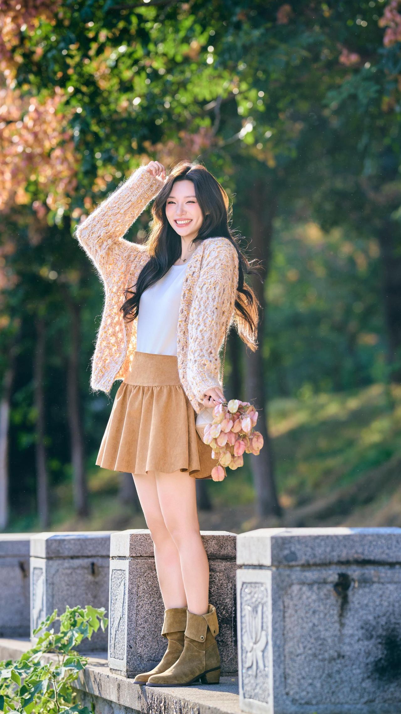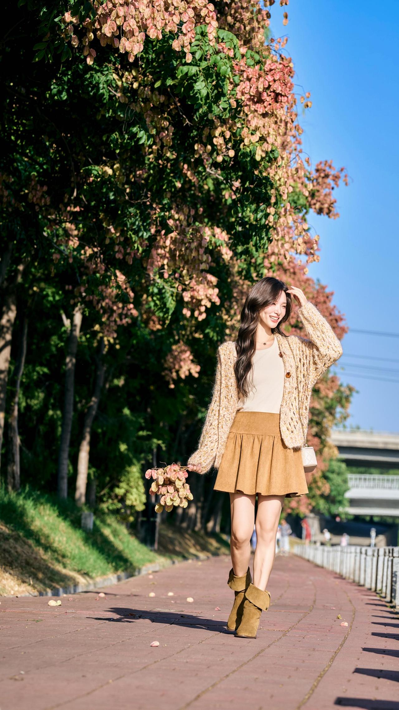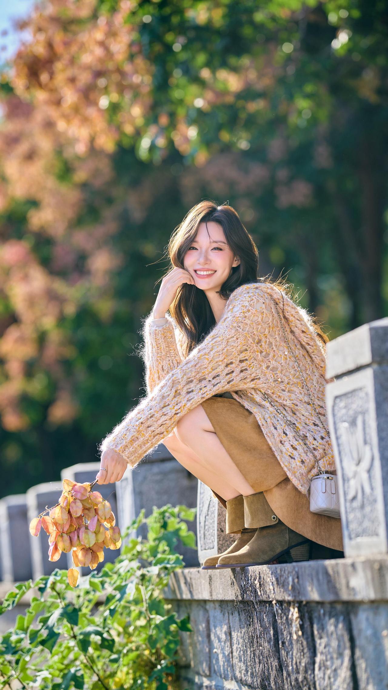秋日公园里的时尚红衣女郎,自信微笑,尽显优雅魅力!🍂💃🏻