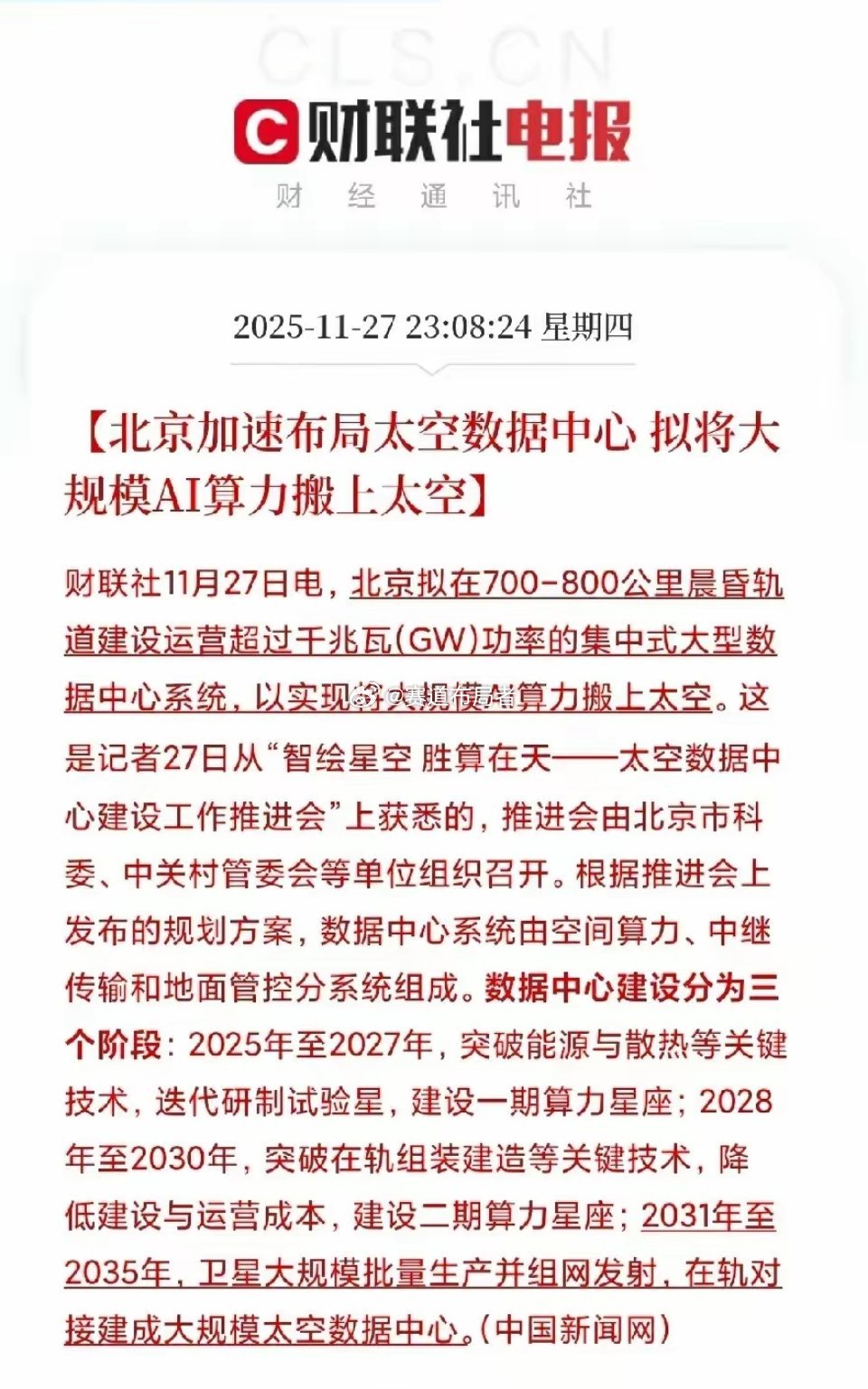 北京重磅抛出太空算力计划!万亿赛道崛起,这些产业链公司要起飞?昨晚A股传来炸裂消息!北京正式官宣重大战略布局——要在距地球700-800公里的晨昏轨道,打造超千兆瓦功率的太空数据中心,把大规模AI算力直接搬上太空!这波操作不仅填补了国内太空计算领域的关键空白,更直接引爆了数万亿级新赛道,产业链上的相关公司要迎来高光时刻了?一、太空算力为啥是"王炸级"风口?三大核心逻辑看懂潜力1. 技术突破解决地面痛点:太空数据中心太会"借力"了!利用宇宙极寒环境实现高效散热,还能全天候捕获太阳能,完美攻克地面数据中心能耗高、散热难的行业瓶颈。据预测,到2035年全球在轨数据中心市场规模将飙升至390.9亿美元,十年复合增长率高达67.4%,增长爆发力拉满!2. 产业生态加速落地:北京已经牵头组建太空数据中心创新联合体,24家企业+科研机构抱团发力,第一代试验星"辰光一号"都已研制完成,计划今年底或明年初发射。联想创投等机构早就抢先布局,轨道辰光更是完成1.4亿元融资,产业落地节奏远超预期。3. 应用场景全面开花:未来将推出"天数天算"和"地数天算"两种服务模式——太空数据直接在太空处理,能把气象卫星数据更新从周级压缩到小时级;地面数据上传太空运算,还能大幅提升AI训练效率,覆盖航天、气象、AI等多个高价值领域。二、5大受益方向+核心标的,精准锁定机会1. 火箭制造(发射核心支撑):- 蓝箭航天:液氧甲烷火箭技术行业领先,为太空数据中心发射提供硬核支撑;- 星际荣耀:深耕可复用火箭研发,降低发射成本,提升商业化效率;- 星河动力:突破火箭回收关键技术,技术壁垒突出;- 科工火箭:快响应发射领域专家,适配太空项目快速落地需求。2. 卫星研制(数据中心载体):- 天仪研究院:SAR卫星星座批量化生产先锋,保障卫星供给能力;- 长光卫星:"吉林一号"光学遥感星座龙头,卫星应用场景丰富;- 银河航天:低轨宽带通信星座建设核心力量,搭建太空通信桥梁;- 中科卫星:具备卫星全链条技术能力,产业链整合优势明显。3. 算力芯片(核心算力支撑):- 陕西华达:布局宇航级设计、星载模块预研,贴合太空算力特殊需求;- 华力创通:推进星载计算处理设备研制,直接对接太空数据处理需求。4. 通信传输(数据连接关键):- 中国信科:主导5G星地融合通信标准,掌握行业话语权;- 普天科技:深度参与星间/星地链路建设,保障数据传输稳定性;- 南京英田光学:提供卫星激光通信解决方案,提升传输速率。5. 新材料(设备保障基础):- 巡航新材料:研发轻质耐高温热防护材料,适配太空极端环境;- 国玻新能源:专注电池热失控防护与轻量化材料,保障设备安全运行。从地面算力到太空计算,这场技术革命正在催生数万亿级市场空间!在政策强力护航、技术快速突破、资本加速进场的三重驱动下,商业航天与AI算力融合的黄金时代已经来临,相关产业链标的值得重点关注~⚠️ 风险提示:以上仅为行业动态和标的梳理,不构成任何投资建议。太空算力赛道技术壁垒高、项目落地存在不确定性,短线交易需警惕题材炒作波动风险,决策前请结合公司基本面和盘面资金流向谨慎判断!