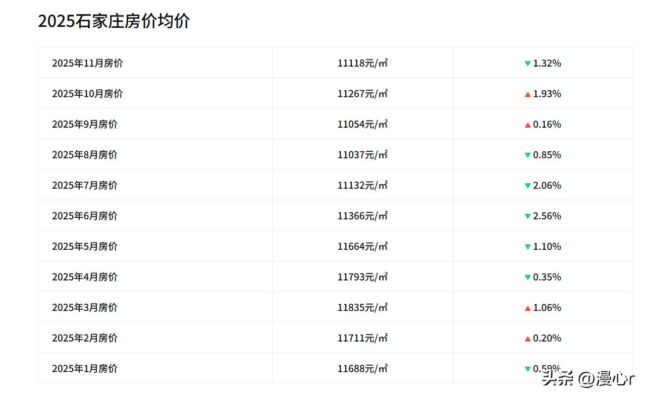 楼市如股市,一月一个价! 2025年11月,石家庄裕华区二手房均价13796元; 2025年11月,石家庄长安区二手房均价11178元; 2025年11月,石家庄新华区二手房均价11716元; 2025年11月,石家庄桥西区二手房均价11563元; 2025年11月,石家庄高新区二手房均价9721元。 数据说明:以上均价数据,均来自房天下数据,只是作为数据分析的参考,旨在反映石家庄2025年11月各区房价情况,不能准确映射当地实际房产价格。因为新房、二手房、不同区域不同位置的房价差别较大,占比也不同,仅通过一个均价不能一概而论。下面漫心r就把整理出来的数据进行一个初步的分析,和大家分享一下感受: 真是应了那句话,楼市如股市,一月一个价,裕华区的房价稳居石家庄第一,不过不同地段的房价差异还是挺大,一些高端小区,比如槐北路165号院,均价达30089元,而一些老旧小区,价格也就1万多。 长安区今年以来房价走势确实不容乐观,从年初的12216元跌至11月的11410元,同比下跌5.57%。这种持续性的下跌的态势已经形成了一种负循环:房价越跌,购房者越观望;越观望,成交量越低迷,房价继续下跌。 新华区和桥西区的房价处于中等水平,两者价差不大,从下跌幅度来看,桥西区同比下跌5.82%,新华区同比下跌3.7%。 高新区11月的价格比较亲民,但也有一些高端项目,比如天山熙湖澜岸均价达25376元。 2025年11月,石家庄的房市整体属于买方市场,购房者有很大的选择和议价权。