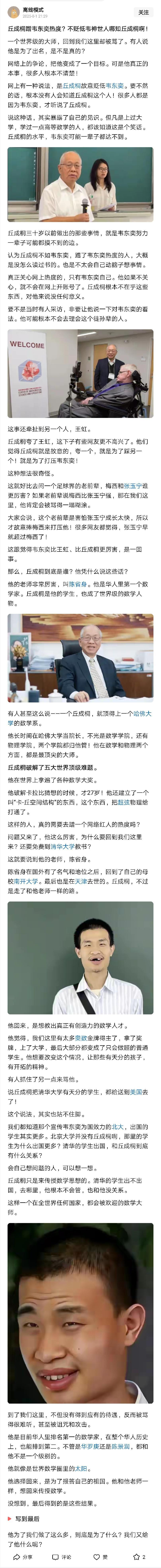 数学家丘成桐先生曾在一次论坛上说,“大众喜欢听这些好笑的故事,数学家一瓶水两个馒头就很伟大了,这完全不是数学家应当的形象,其实数学家很正常,有血有肉,也有小孩,和普通人没区别。”这句话其实说的是常识,但却有网友认为是“贬低”他们心中的“韦神”,他们甚至认为“韦神”是最纯粹的数学家。这根本不了解科学家,也不利于鼓励年轻人成为科学家。科学家不是“神”,就是普通人,有普通人的爱好、生活,而不是不食人间烟火。关注科学家,应该关注的是他/她的学术能力与学术贡献,而非外在的形象。“韦神”晋升副教授,也是根据他的教学与学术研究成果,而非其他。
