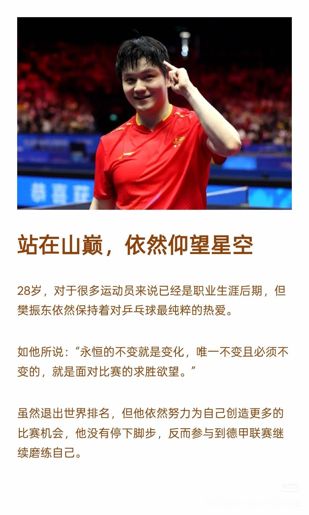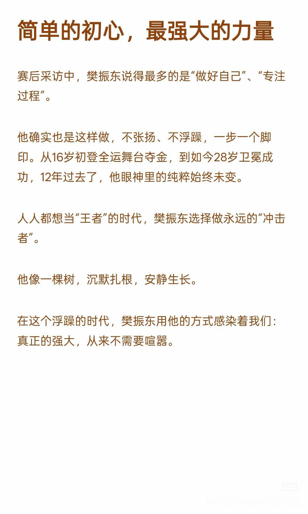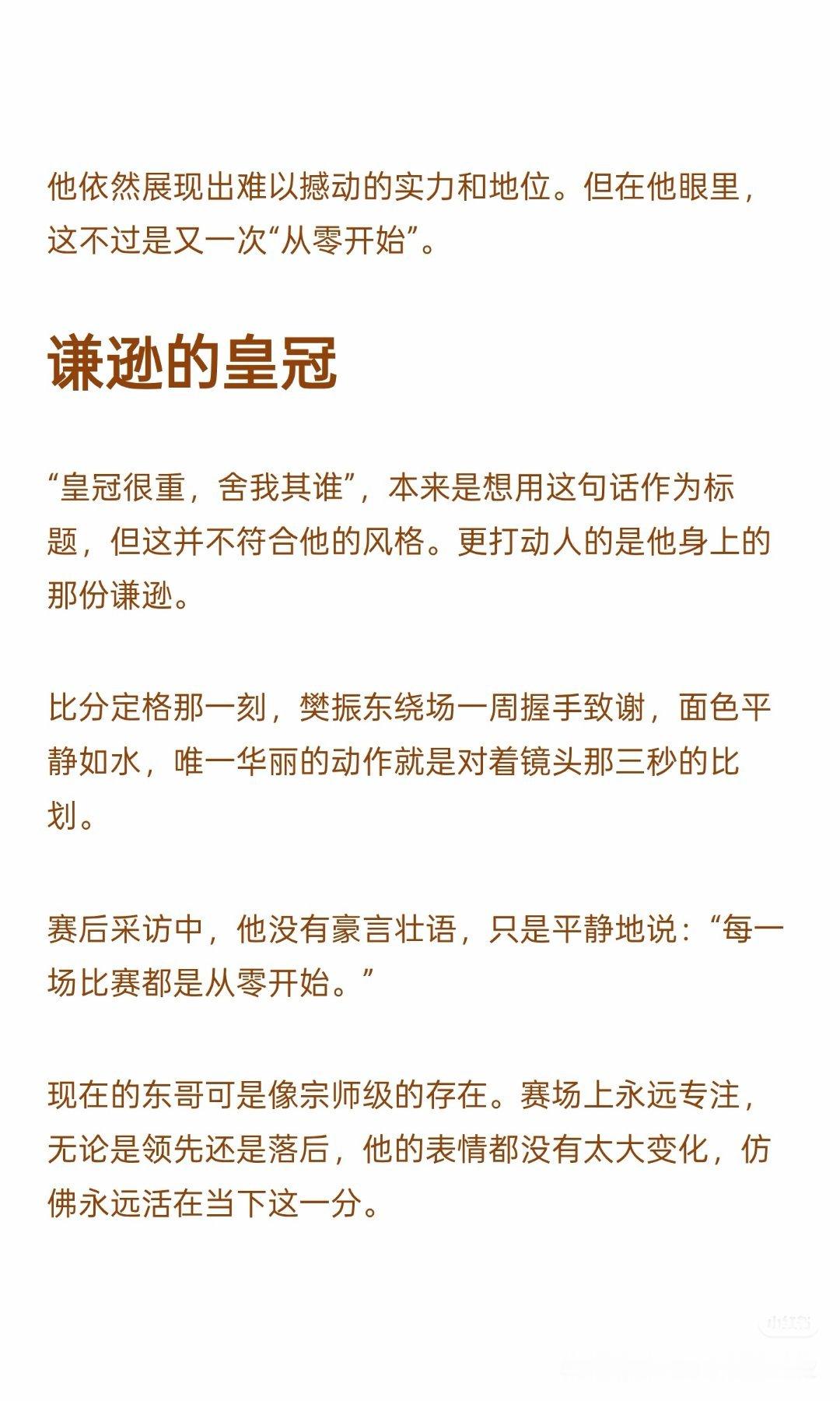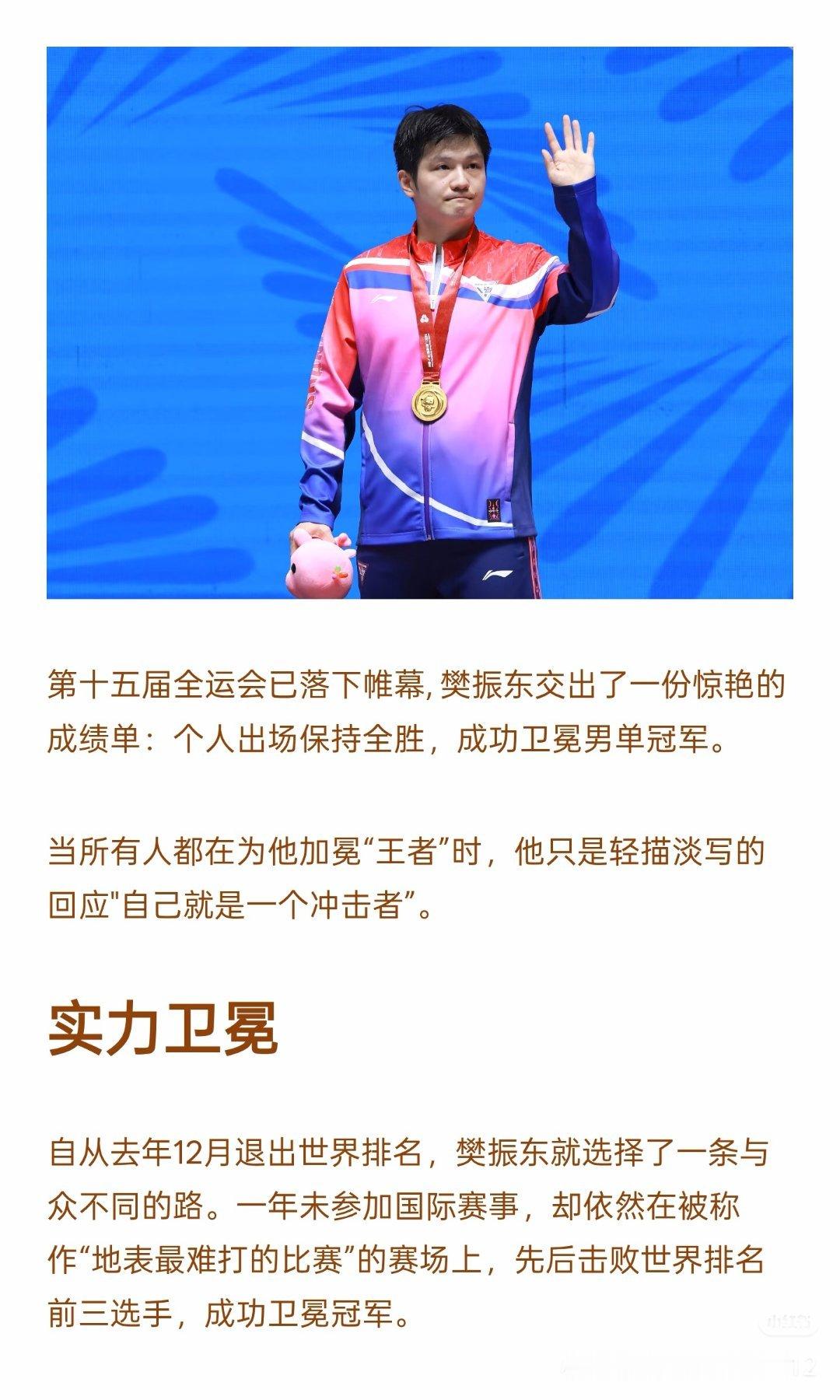 樊振东 | “我只是个纯粹的冲击者”“可能是最后的结果变了,但我的心态一直没有变,进入决赛自己就是一个冲击者,不管输赢,我收获了很多不同的心态,同样是冲击者面对最后的比赛,自己怎样尽量的去战胜自己,去做到自己想做的事,这是一个非常美妙的过程。”第十五届全运会已落下帷幕, 樊振东交出了一份惊艳的成绩单:个人出场保持全胜,成功卫冕男单冠军。当所有人都在为他加冕“王者”时,他只是轻描淡写的回应"自己就是一个冲击者”。🏓 实力卫冕自从去年12月退出世界排名,樊振东就选择了一条与众不同的路。一年未参加国际赛事,却依然在被称作“地表最难打的比赛”的赛场上,先后击败世界排名前三选手,成功卫冕冠军。他依然展现出难以撼动的实力和地位。但在他眼里,这不过是又一次“从零开始”。🏓 谦逊的皇冠“皇冠很重,舍我其谁”,本来是想用这句话作为标题,但这并不符合他的风格。更打动人的是他身上的那份谦逊。比分定格那一刻,樊振东绕场一周握手致谢,面色平静如水,唯一华丽的动作就是对着镜头那三秒的比划。赛后采访中,他没有豪言壮语,只是平静地说:“每一场比赛都是从零开始。”现在的东哥像宗师级的存在。赛场上永远专注,无论是领先还是落后,他的表情都没有太大变化,仿佛永远活在当下这一分。🏓 站在山巅,依然仰望星空28岁,对于很多运动员来说已经是职业生涯后期,但樊振东依然保持着对乒乓球最纯粹的热爱。如他所说:“永恒的不变就是变化,唯一不变且必须不变的,就是面对比赛的求胜欲望。”虽然退出世界排名,但他依然努力为自己创造更多的比赛机会,他没有停下脚步,反而参与到德甲联赛继续磨练自己。🏓 简单的初心,最强大的力量赛后采访中,樊振东说得最多的是“做好自己”、“专注过程”。他确实也是这样做,不张扬、不浮躁,一步一个脚印。从16岁初登全运舞台夺金,到如今28岁卫冕成功,12年过去了,他眼神里的纯粹始终未变。人人都想当“王者”的时代,樊振东选择做永远的“冲击者”。他像一棵树,沉默扎根,安静生长。在这个浮躁的时代,樊振东用他的方式感染着我们:真正的强大,从来不需要喧嚣。樊振东冠军樊振东十五运两胜王楚钦邓亚萍说樊振东是t0级选手全国人民都想樊振东回来打球