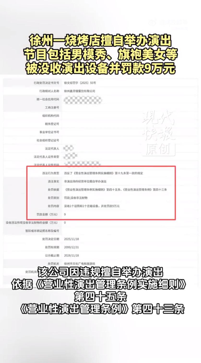 最近徐州一家叫“鑫牙缝”的烧烤店因为搞了场小演出,直接被罚了9万,还被没收了话筒和音箱,这事在网上吵得沸沸扬扬。本来烧烤店想搞点特色吸引顾客,没想到踩了法律红线,好好的引流操作变成了“天价教训”。 不少人觉得纳闷,烧烤店里请人唱唱歌活跃气氛,不是很常见的操作吗?怎么就违法了?其实这里面有明确的法律规定,烧烤店属于餐饮场所,并不是专门的演出场地,也就是“非演出场所经营单位”。按照相关条例,这种地方要是想办营业性演出,要么得自己拿到《营业性演出许可证》,要么就得委托有资质的演出经纪机构来承办,不能自己随便找个歌手就开唱。而这家烧烤店既没办证,也没找正规经纪公司,就用一个话筒、一个音箱搭了简易舞台搞有偿表演,核心目的还是吸引顾客消费,完全符合“擅自举办营业性演出”的违法情形,所以才被文旅局查处。 更让人热议的是处罚力度,很多网友觉得“一把话筒罚9万”有点太重了,调侃道“这得烤多少串羊肉串才能赚回来”。毕竟烧烤店利润不算高,9万元罚款对小商户来说确实是笔不小的开支,还有人觉得很多老板可能根本不知道有这个规定,应该先宣传教育再罚款。但也有网友支持处罚,认为现在有些餐饮场所的“演出”越来越不规范,甚至有低俗、打擦边球的情况,而且演出时噪音大、人员密集,还存在消防安全隐患,严格执法才能起到警示作用。 其实这次处罚并不是“小题大做”,相关部门是依据《营业性演出管理条例》和实施细则来的,里面明确规定,非演出场所经营单位擅自举办演出,没有违法所得或者违法所得不足1万元的,就要处5万到10万元罚款,这家店被罚9万,属于规定范围内的处罚,大概率是因为违法情节相对严重。而且这也不是个案,之前多地的餐饮、酒吧都因为类似的操作被罚过,只是罚款金额根据具体情况有所不同。 事件曝光后,这家烧烤店也发了公开致歉,但没详细说明后续会怎么整改。这事也给所有餐饮、娱乐行业的老板提了个醒,想通过搞演出、做特色吸引顾客的思路没问题,但前提是得懂法守法,先把该办的手续办齐,别抱着“没人查”的侥幸心理。毕竟生意要想长久做下去,合规经营才是底线,不然看似热闹的引流操作,可能会给自己带来意想不到的损失。 来源:现代快报