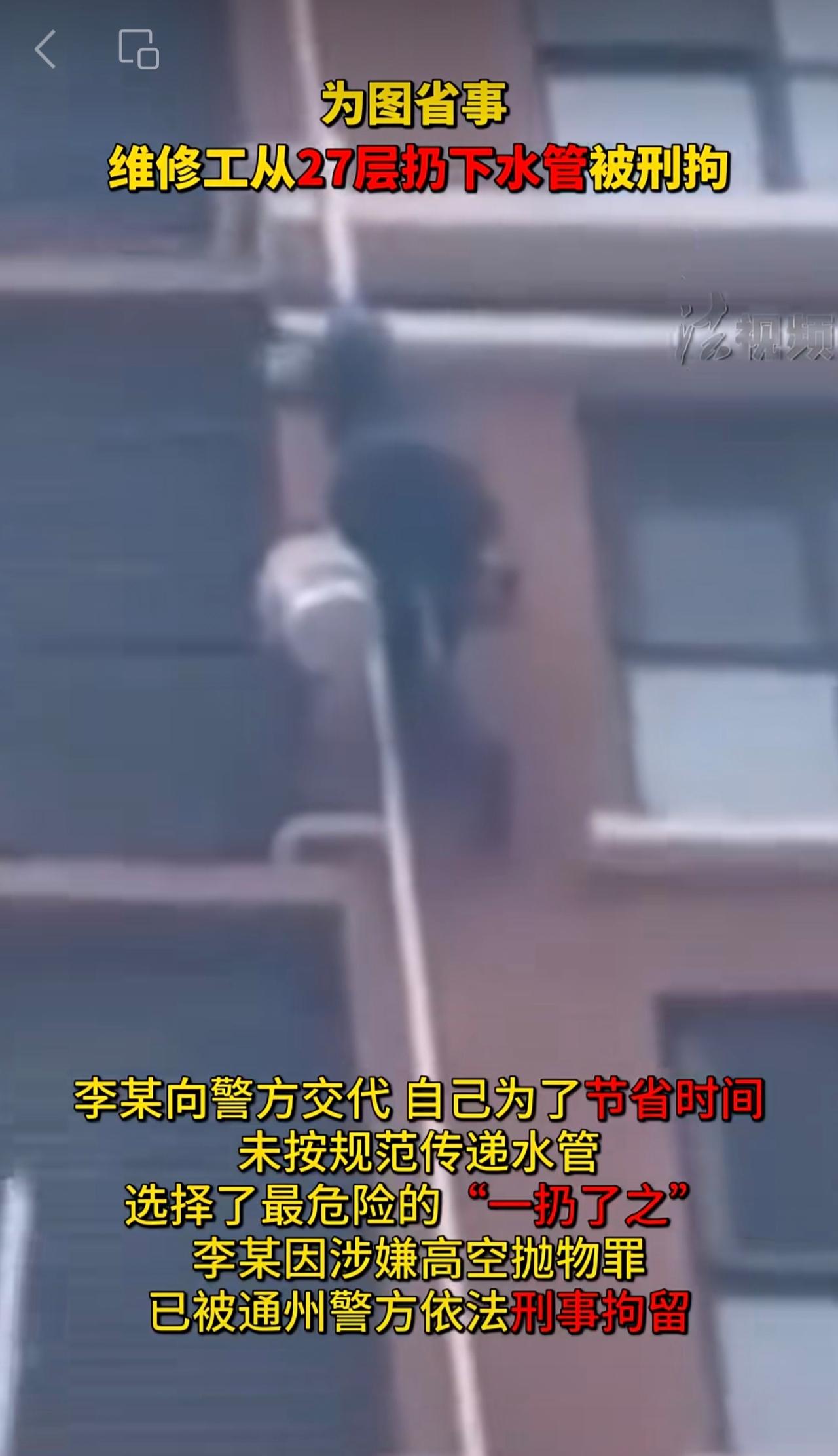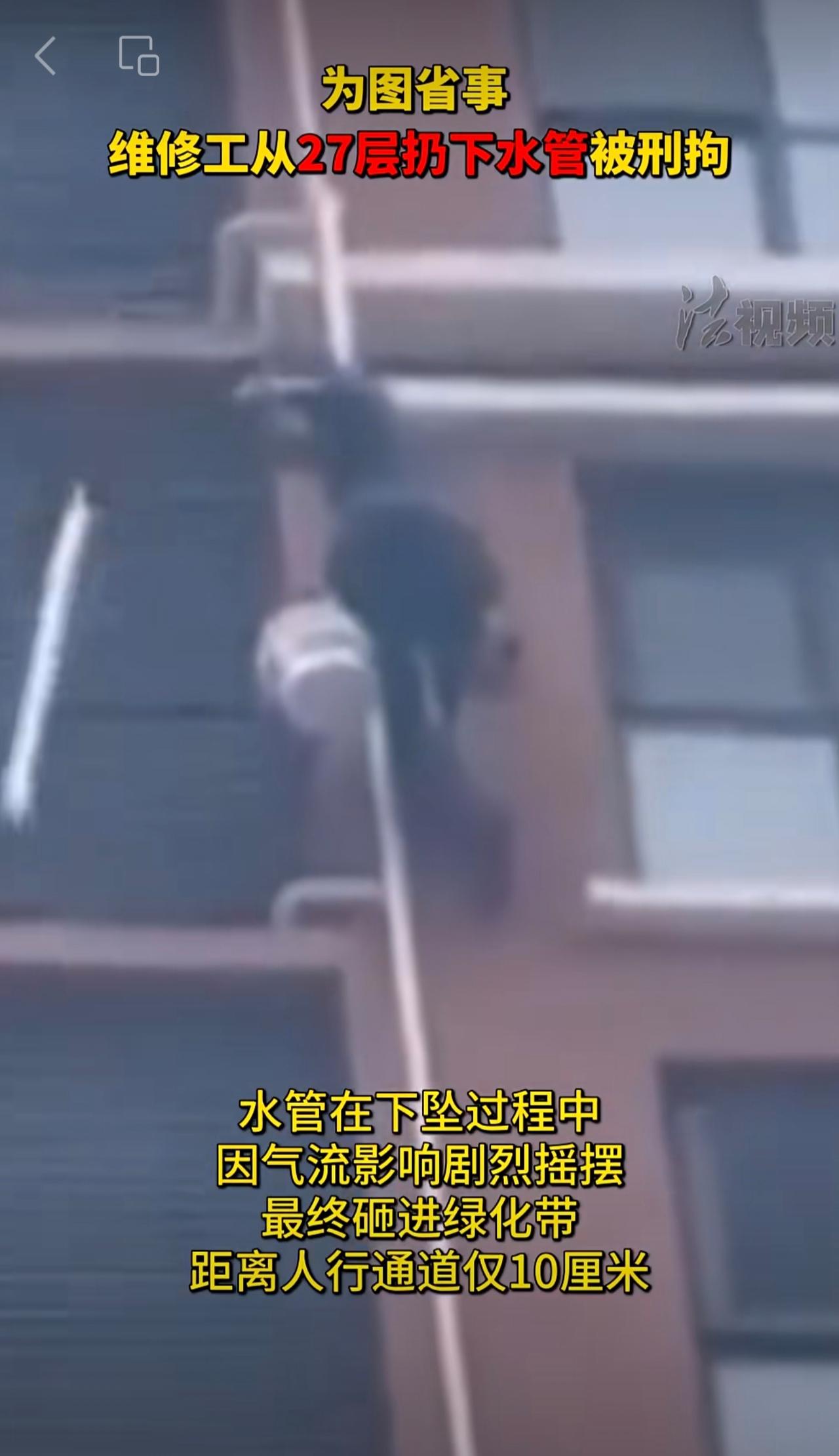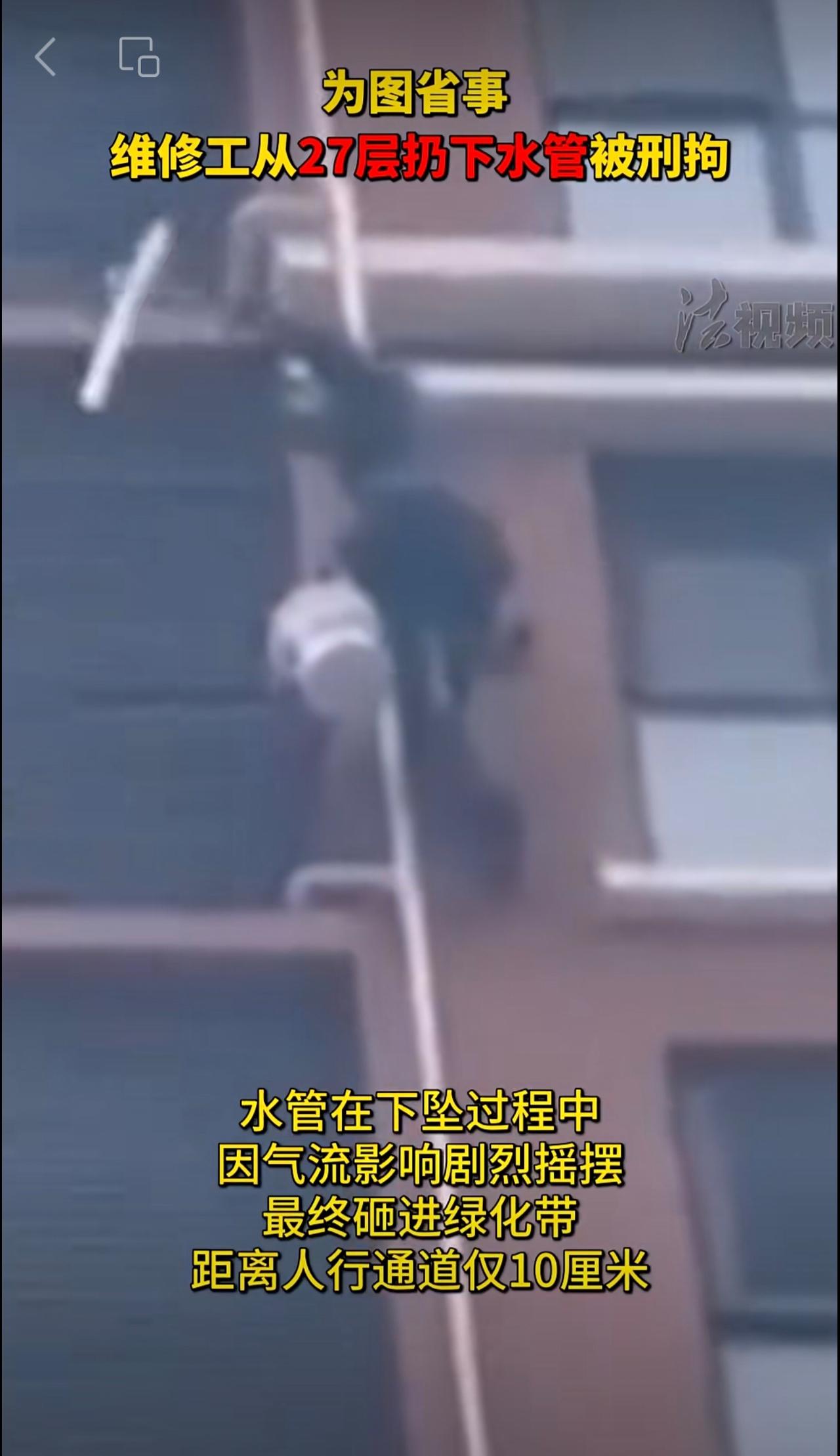 为图省事 ,维修工从27层扔下水管被刑拘!
