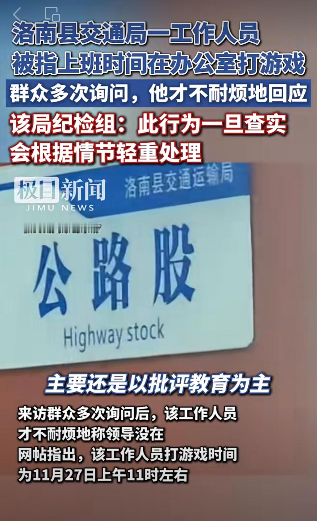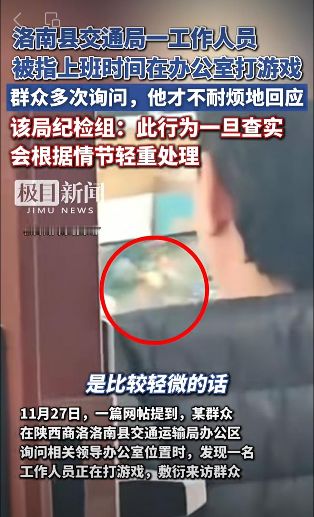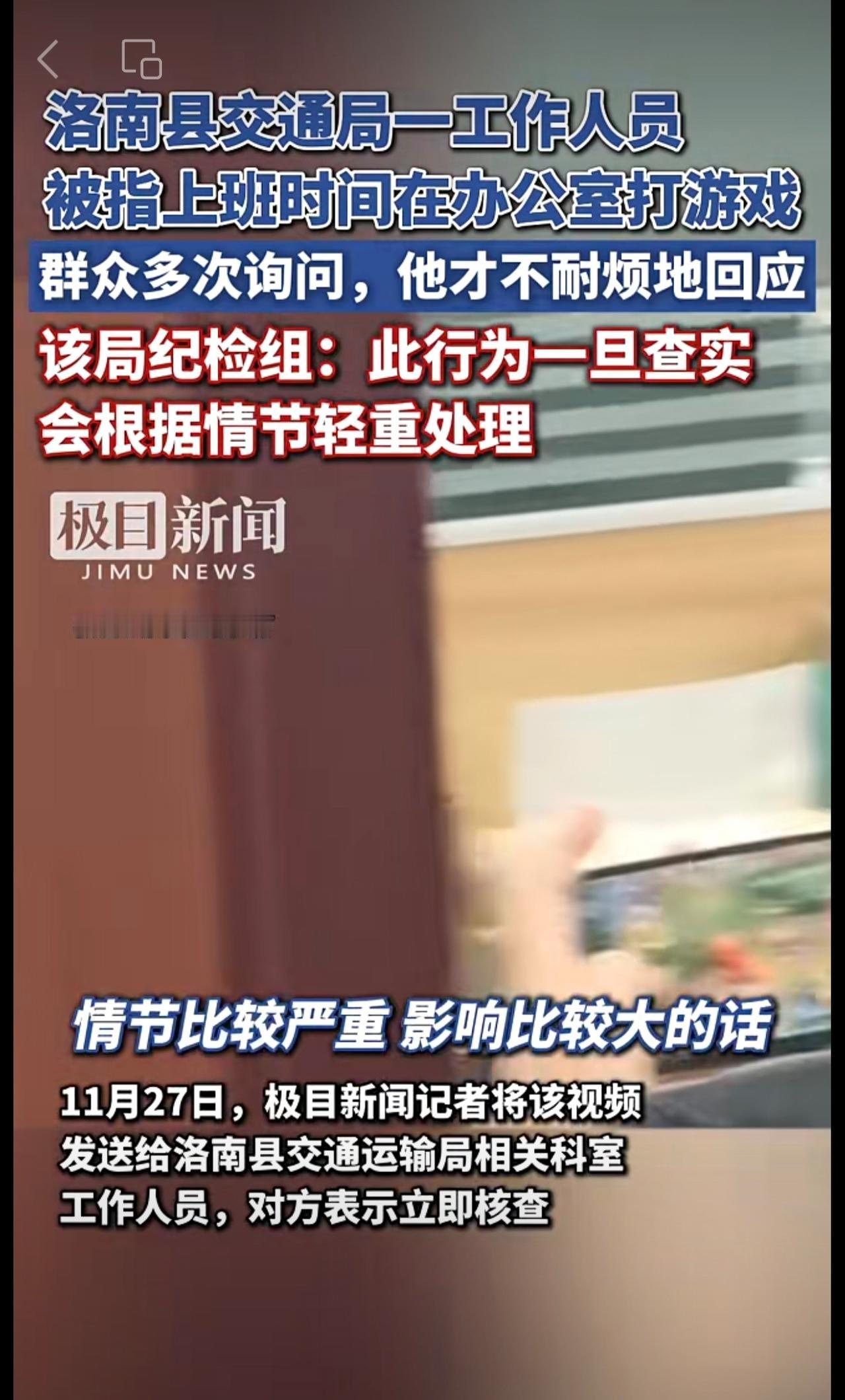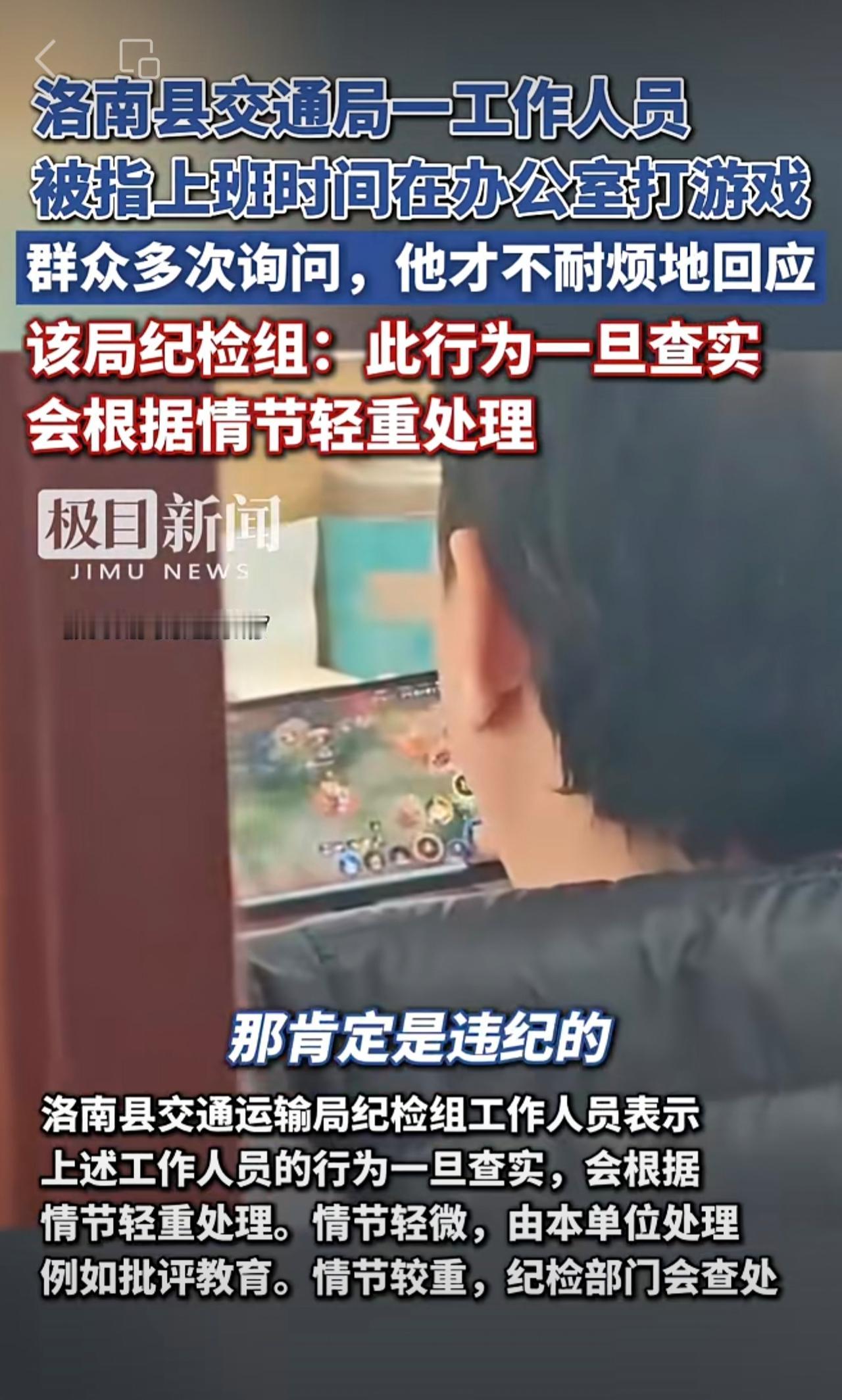 洛南县交通局一工作人员被指上班时间在办公室打游戏,敷衍来访群众。该局纪检组:此行为一旦查实,会根据情节轻重处理