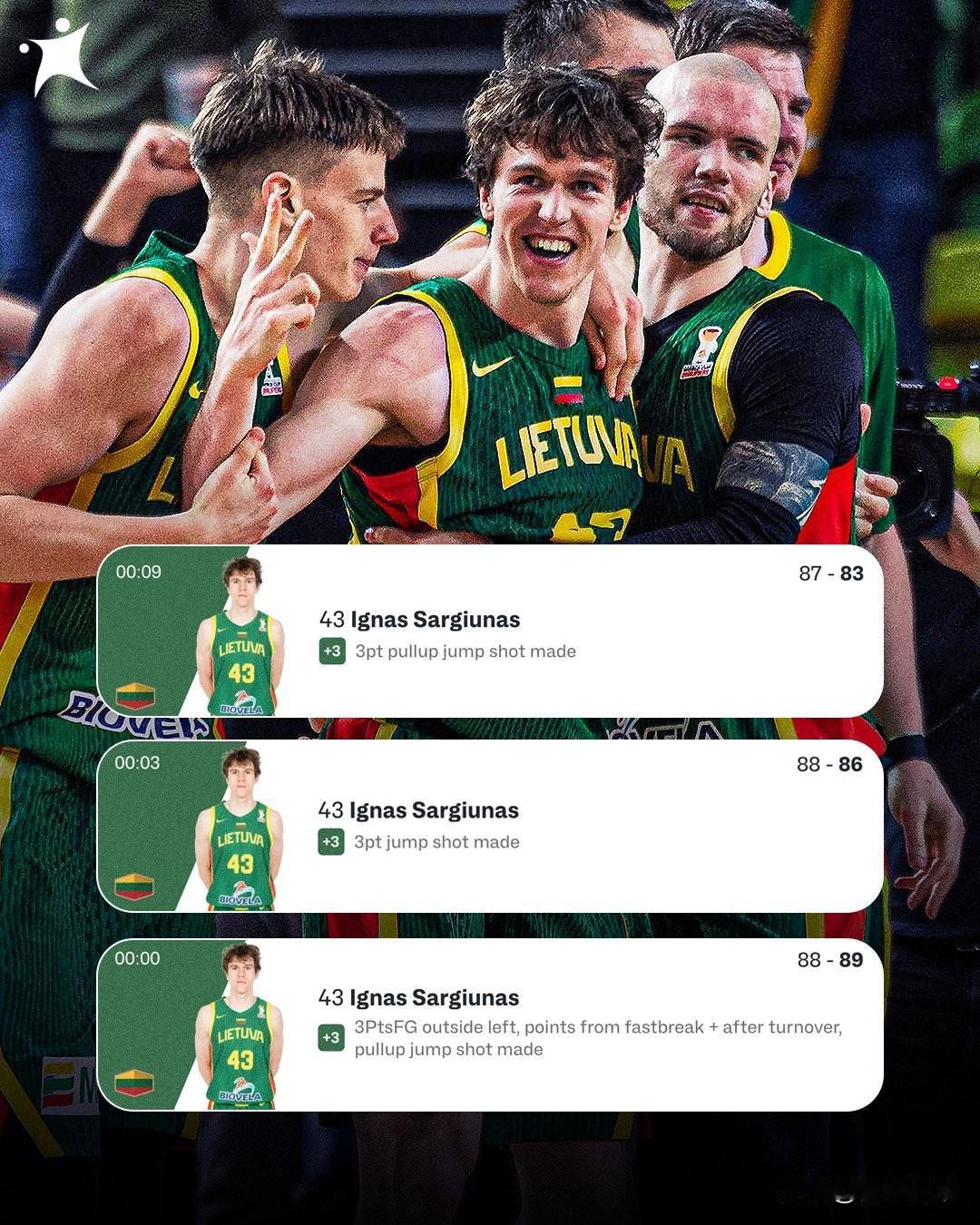比麦迪35秒13分还神奇,立陶宛上演13秒9分超级逆转压哨绝杀! 在立陶宛与英国的男篮世界杯欧洲区预选赛上,在比赛还剩12.9秒的时候,立陶宛还80-87落后英国7分,这即使在NBA都已经彻底没有悬念了,即使麦迪重生也无力回天。 但是万万没想到,立陶宛的球员却没有放弃,先是用2.9秒投进一记三分,然后又立陶宛马上犯规英国两罚中一,立陶宛依然以83-88落后5分,随后立陶宛 球员再次轰进了三分只落后2分了,最后时刻英国也遭遇了世界难题“发边线球”失误,被立陶宛抢断然后用一记超远三分完成压哨绝杀,在不到13秒的时间里完成了7分超级逆转。 神奇的是这三记三分全都由一个人投进的,当年麦迪还需要35秒才能得到13分,今天立陶宛的球员却只用13秒就拿到了9分,真的是比麦迪时刻都牛逼。