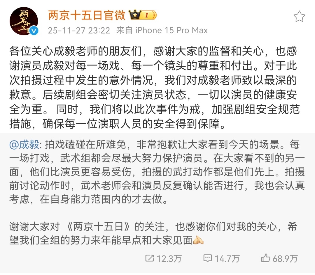 两京十五日剧方回应:感谢成毅对每一场戏、每一个镜头的尊重和付出。对于此次拍摄过程中发生的意外情况,对成毅老师致以最深的歉意。我们将以此次事件为戒,加强剧组安全规范措施。希望剧方说到做到不要辜负这个敬业拼命处处为人着想的好演员,大家会一直监督的成毅回应两京十五日拍摄受伤