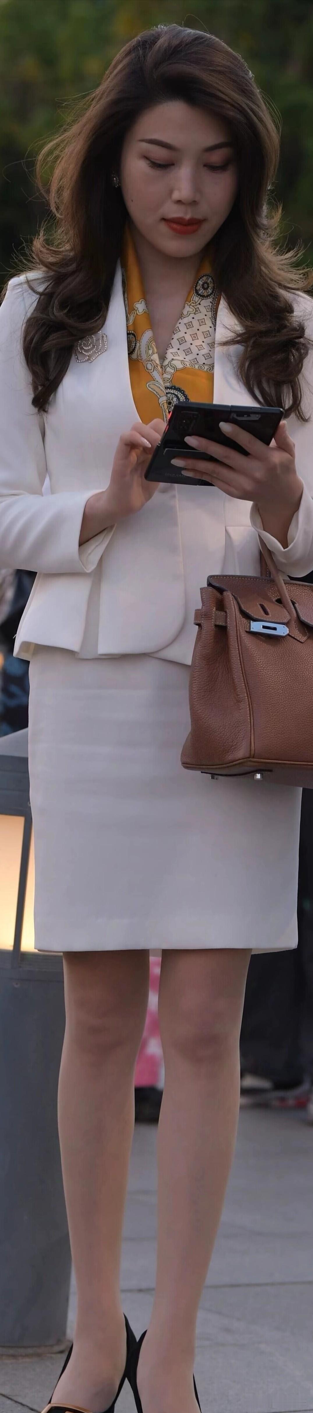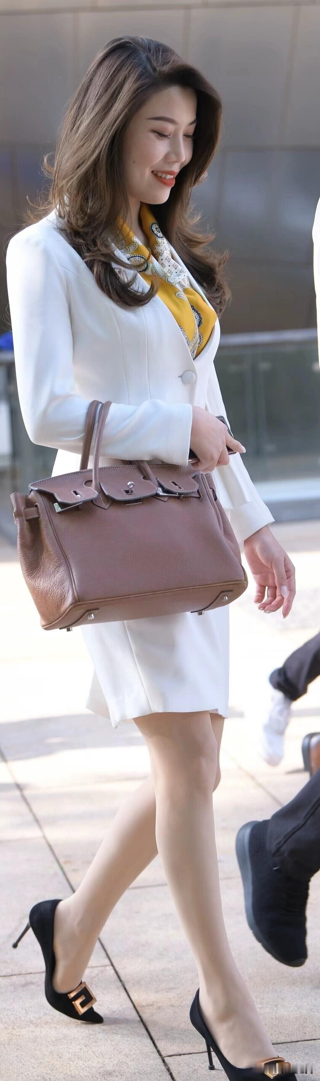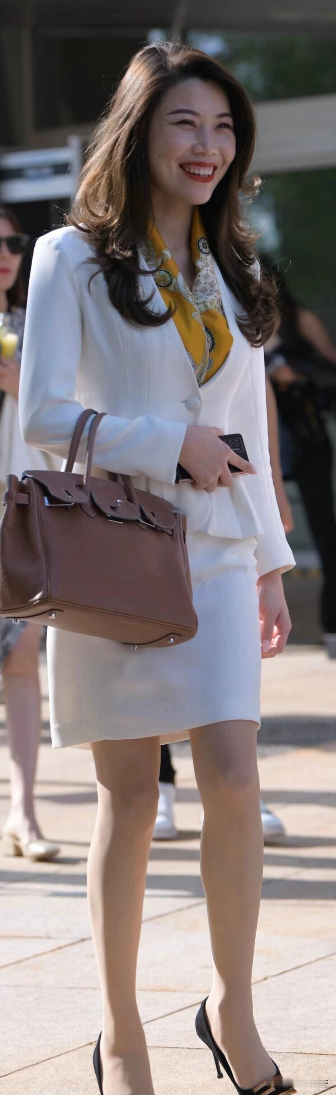 白色西装套裙搭配黄色丝巾,优雅又干练!棕色手提包与黑色高跟鞋加持,职场女性的精致穿搭。