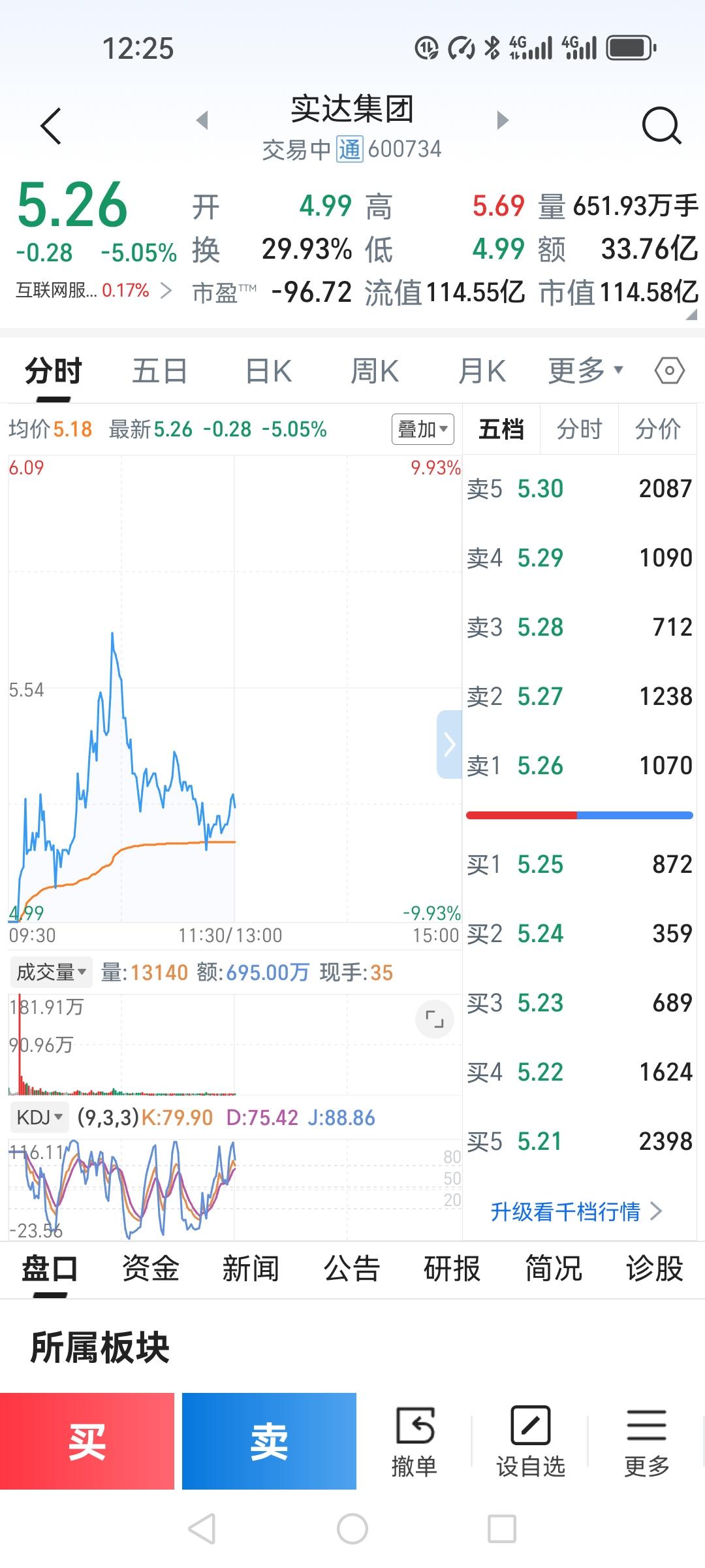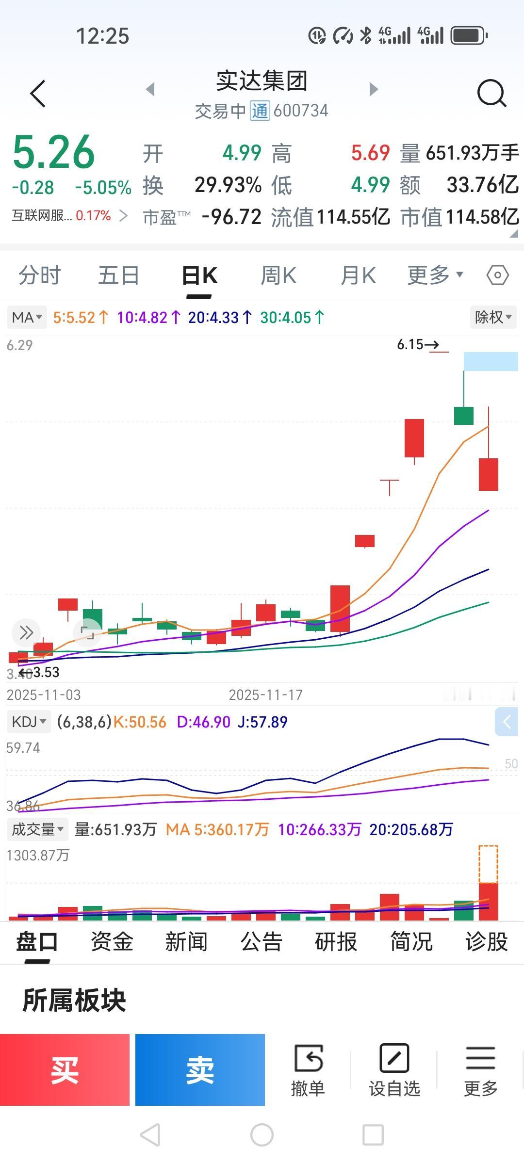 今天道听途说冲动的在跌停板4.99把实达集团卖了三分之二。 结果开盘后就开始上升,最高5.69,中午收盘5.26,成交33.76,换手率29.93%,成交量比昨天放大的很多,换手率未达到了近30了,是主力吸收还是散户怕在下跌,都在出货。我总得来说这只票还是盈利的,接下来继续关注。个人观点不存在推荐,股市有风险,投资需谨慎。实达集团 炒股心得分享