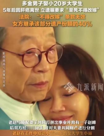 山东济南,一男子离婚后,娶了比其小20岁的女大学生。岂料,婚后5年,2024年男子肝癌过世。男子早有防备,生前立了一份遗嘱,女大学可以继承他名下的千万遗产,但前提条件是终身不得改嫁。 一份附带“终身不得改嫁”条件的遗嘱,把一家人都拖进了法庭。当财产继承和婚姻自由碰到一起时,到底该听谁的?最终,法院的判决不仅理清了财产归属,更说透了法律里的人情事理。 老赵和原配妻子一起打拼,攒下了不少家业,还生了个儿子叫赵峰。后来两人离婚,年近半百的老赵又和一个女大学生再婚,婚后还生了个儿子叫赵东。 可谁也没料到,婚后第五年,老赵因病离世。临终前特地立了遗嘱:把名下的三套房产和存款、股票这些资产做了分配。 一套房留给大儿子,另一套留给二儿子,剩下的一套房和所有的现金、理财都给了女大学生,但前提是:至死不得改嫁。 写完遗嘱没几天,老赵就因为病情加重走了。老赵走后,小丽看着遗嘱犯了难。她理解丈夫担心自己和小儿子的心意,但“终身不得改嫁”的条件让她没法接受。 毕竟她才三十出头的年纪,总不能一直单身下去,但她又舍不得巨额遗产,于是就闹上了法院,要求按照遗嘱继承财产,但拒绝接受那个限制再婚的条件。 法院认为:老赵立遗嘱处分自己的财产没问题,这是他的权利,但权利不能乱用,更不能拿来限制别人的基本自由。我国法律明确规定:不管是结婚还是离婚、再婚,都没人能干涉。 老赵用遗产做筹码,逼着女大学生在婚姻和财产之间选一个,这本质上就是侵犯了她的婚姻自主权,既违反法律规定,也不合情理,所以这个“不得改嫁”的条件肯定是无效的。 最终,法院判定女大学生可以继承40%的遗产,剩下的再由老赵的父亲、赵峰和赵东这些法定继承人按份分割。 其实,这案子看似是财产纠纷,核心讲的还是权利的边界问题。立遗嘱的人可以安排自己的财产,但不能把手伸到别人的人身权利里。婚姻自由这种基本权利,就算是遗嘱也不能限制。 对此你有什么看法?欢迎在评论区留言讨论。案件 婚姻遗产 信息来源: 潇湘晨报2023-8-17|《男子娶小20岁女子要求至死不得改嫁 遗嘱条款无效引发争议》 爱济南客户端|《多金老板立遗嘱要求小20岁妻子“至死不得改嫁”,死后法院判决:该限制无效》 九派新闻|《男子离婚后迎娶小近二十岁女大学生,病重时立遗嘱要求对方不得改嫁,否则不得继承遗产》 文|墨海 编辑|史叔