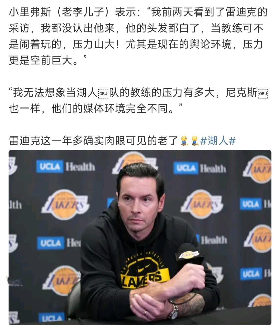 现在人人都说雷迪克压力大,当湖人教练头发都白了?? 我感觉他工作还不错,把湖人搞得很好。 让东契奇成为一哥,让里夫斯成为第二得分手,让詹姆斯回来也能融入球队。 这些事可不简单,有些球星会闹腾,教练掌握不好就完蛋,雷迪克做的真好。 希望他不要白头发,还能执教湖人很多年呢![偷笑]