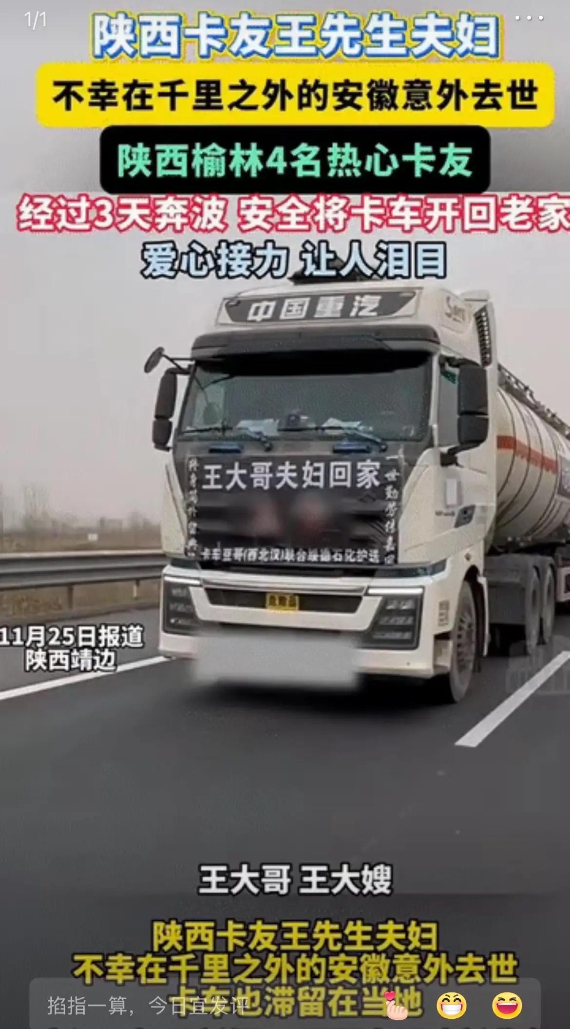 真的是泪目了! 陕西靖边县一对40岁左右的80后卡车夫妻在安徽完成卸货后的车辆检测环节突发意外,不幸双双离世。 这场毫无预兆的悲剧,让一个原本完整的家庭瞬间崩塌,只留下两个孩子,以及年迈的老人! 谁能想到啊!前一秒还在跟家人报平安说“货卸完了,很快就能回家”,后一秒就阴阳两隔。这对夫妻我虽不认识,但一想到他们常年开着大卡车奔波的样子,心里就揪得慌。80后啊,正是上有老下有小的年纪,肩上扛着的是一整个家的希望。他们大概率是为了多挣点运费,少休息一会儿,多跑一趟活儿,毕竟两个孩子要上学,年迈的父母要养老,哪一样都离不开钱。 跑长途货运的司机,谁不是把命别在裤腰带上?我有个表哥就是开卡车的,他跟我说过,跑一趟长途少则三四天,多则半个月,吃的是泡面咸菜,睡的是驾驶室的硬座椅,有时候为了赶时间,连续开十几个小时车,眼睛都熬红了。遇到路况差的路段,颠簸得能把人颠起来,夜里还要提防偷油的、碰瓷的,真的是身心俱疲。这对靖边的夫妻,肯定也经历过无数个这样的日夜,他们以为只要再拼几年,等孩子再大一点,就能歇一歇,可偏偏天不遂人愿。 最让人揪心的是那两个孩子和年迈的老人。孩子还小,正是需要父母陪伴的年纪,突然失去双亲,以后的日子该怎么过?年迈的老人,辛辛苦苦把儿子儿媳拉扯大,本想等着他们养老,结果却要白发人送黑发人,这种痛苦真的不是一般人能承受的。想想就知道,这个家以后的日子会有多难,没有了经济来源,老人要照顾两个孩子,生活的重担会压得他们喘不过气。 其实这场悲剧也暴露了长途货运行业的一些问题。车辆检测环节本来是为了保障安全,怎么就变成了意外的导火索?是检测设备存在隐患,还是工作人员操作不当?这些都需要相关部门好好调查,给逝者家属一个交代,也给所有跑货运的司机一个安全的环境。还有,现在货运行业竞争激烈,运费压得很低,司机为了挣钱不得不长时间疲劳驾驶,安全隐患极大。相关部门是不是应该出台一些政策,规范货运市场,保障司机的合法权益,让他们不用再拿命换钱? 这些年,我们总能看到卡车司机意外离世的新闻,每一次都让人痛心。他们是公路上的“摆渡人”,把各种物资送到全国各地,保障着我们的日常生活,可他们的安全却常常被忽视。他们需要更完善的社会保障,需要更规范的行业监管,需要更多人的关注和理解。希望这次的悲剧能引起相关部门的重视,不要再让类似的事情发生。 逝者已矣,生者如斯。愿这对夫妻一路走好,也希望他们的家人能坚强起来,渡过难关。社会各界如果能伸出援手,帮他们一把,让两个孩子能顺利成长,让老人能安度晚年,也是对逝者的一种慰藉。 生命真的太脆弱了,我们永远不知道意外和明天哪个会先来。所以,趁现在还来得及,好好珍惜身边的人,多陪陪家人,不要等到失去了才后悔莫及。也希望所有跑长途的司机师傅们,一定要注意安全,不要疲劳驾驶,定期检查车辆,平安才是回家最近的路。 各位读者你们怎么看?欢迎在评论区讨论。