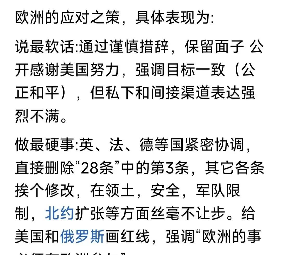 网友拿欧乌应对川普“28条”,谈欧洲外交艺术:外交不是喊打喊杀,而是“说最软的话,办最硬的事”!是“只要里子,不要面子”!此为外交艺术。 最近川普抛出的“俄乌和平28条”,明眼人都能看出来是霸王条款——逼着乌克兰放弃东部领土、承认俄占区合法,等于直接卖了乌的主权。更狠的是他放话:不答应就断供武器情报,这招够阴,泽连斯基当时都慌得没了主意。 这时候欧洲老大哥们站出来了,把泽连斯基和美国的卢比奥请到瑞士开了个会。你猜他们怎么操作?表面上对着川普一顿猛夸:“美国援乌功劳最大,没有你们带头,我们撑不到现在。”把川普哄得眉开眼笑,毕竟他最爱听好话,虚荣心一满足,脾气就小了一半。 但暗地里一点没让步:“这28条没跟乌商量、没问欧洲意见就公开,是卖盟友啊!乌主权没了,欧洲安全也受威胁,这不符合二战后的秩序。”几句话戳中要害,卢比奥也不得不承认协议确实不公。 结果双方把28条改了一遍,删掉了那些明显欺负人的条款。现在就等川普点头,还有俄罗斯那边的反应。其实这事儿给我们提个醒:外交不是比嗓门,是看能不能办成事。放低姿态给足面子,反而能拿到想要的结果。要是像泽连斯基一开始那样慌,说不定真被川普牵着走了。 接下来川普会不会认这个修改版?俄罗斯能接受新协议吗?这事儿还没完,咱们得接着看。这种“软话硬事”的智慧,放在任何场合都管用——毕竟里子比面子重要,办成事比喊口号实在。你觉得欧洲这波操作够不够高明?评论区聊聊你的看法