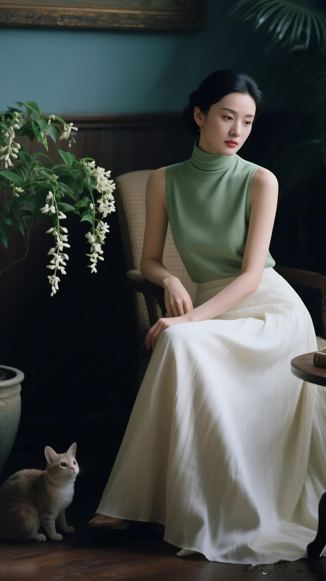 静坐花间思,猫儿伴我眠。你喜欢哪一种气质的美人? 优雅的绿白穿搭,与猫咪的温馨时光。